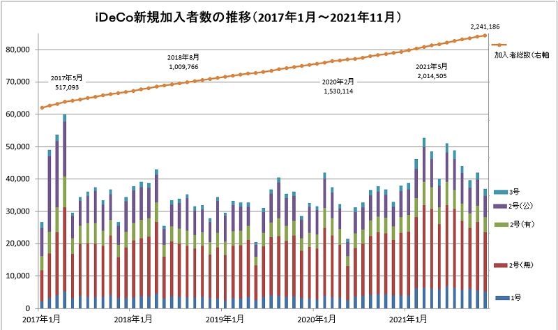 国民年金基金連合会が1月4日に発表したiDeCo(イデコ、個人型確定拠出年金)の業務状況によると、11月の新規加入者数は3万7010人で加入者総数は224万1186人になった。月間の新規加入者は、2021年3月の5.27万人、同年6月の5.11万人という1カ月間に5万人超の加入者をピークにして徐々に退潮傾向にある。11月の3.7万人台は、20年12月末以来の低水準だ。なお、従業員のiDeCoに企業が上乗せ拠出をするiDeCo+(中小事業主掛金納付制度)は、実施事業所数は3695事業所、対象従業員数は2万3348人になった。 11月の新規加入者の内訳は、第2号加入者は2万9536人(前月3万4189人)、第3号加入者は2212人(前月2174人)となった。なお、第2号加入者の中では、企業年金なしの新規加入者が1万8291人(前月2万1095人)。共済組合員(公務員)の新規加入者は6560人(前月8081人)となった。 11月の新規加入者数は全体では前年同期比12.5%増で、前月に引き続き前年同月比2ケタの伸び率になった。第1号が31.9%増、および、第3号加入者は41%増と依然として前年同月比で高い成長を続けている。 iDeCoの新規加入者数は、昨年11月に前年同月比15%増と2ケタの伸び率を記録してから、1年以上にわたって高い伸び率で増加している。この増加の背景には、2019年に話題になった「年金2000万円不足問題」の影響による潜在的な資産運用ニーズの顕在化があり、かつ、2019年以降の世界的な株高の継続によって資産運用での成功体験の広がりがあったと考えられる。さらに、2020年の年初から広がり始めた新型コロナウイルスの世界的なパンデミックによって、想定外の失職などの事態が起こりうることを実感させられたことなどが、人々のお尻を「資産運用の実施」に向けて押したという側面がありそうだ。特に、2019年から3年間で株価指数(S&P500)が2倍以上に値上がりした米国株式の値上がり効果は大きかった。株高効果によって資産運用だけで1億円以上の資産を築く「億り人」の出現も現実化している。 この3年間続いた株高効果は、iDeCoの資産運用の中身を確実に進化させている。たとえば、2018年3月末時点でiDeCoの資産残高1兆6225億円のうち、投信等の価格変動商品での運用は40%だった。預貯金が37%、生損保商品で23%で、元本確保型商品での運用比率が60%を占めていた。それが、2021年3月末現在では加入者の数も大きく増えたこともあって残高総額が2兆9705億円に拡大し、うち、投信等の価格変動商品での運用割合は55.3%と過半数を超えている。これは、iDeCoの資産内訳が公表された2015年3月末以来、年度末ベースで初めてのことだ。 なお、この確定拠出年金(DC)資産を投信等で運用する比率の高まりは、iDeCoの5.5倍超の資産残高(21年3月末時点で約16兆3800億円)がある企業型DCでも同様の傾向がある。21年3月末時点では、投信等での運用比率が54.8%と、こちらも初めて過半数を超えてきた。2005年3月末時点では投信等の比率が31%で、預貯金が49%という比率であったが、21年3月末には預貯金は31.7%にまで低下しており、投信等と立場が逆転している。 今後は、このようなDC資産の積極的な運用による資産拡大効果が実体験としてiDeCoの未加入者へもしみ出すように広がっていくものと考えられる。21年3月末時点で米国のS&P500を投資対象として積立投資を実行した場合、12月末までに投資資金(毎月1万円で合計10万円)が13.2%超プラス成長(約11.32万円)した計算になる。また、18年3月末から毎月1万円をS&P500に連動するインデックス投信で積立投資をしていたら、積立元本が46万円のところ、積立投資評価額は約74.8万円になっている。投資元本が約62.6%増えた計算だ。iDeCoで外国株投信を投資対象にしている割合は21年3月末時点で18%程度だ。2018年3月末は8.2%だったため、こちらの比率も大きく膨らんでいる。 iDeCoで積立投資をして、実際に資産が増えたという実感が共有化された時、iDeCoの新規加入は一段と加速していくものと考えられる。現在、iDeCoの加入者総数は224万人余りに過ぎない。21年11月末の就業者数6650万人の3.4%にも届かないのだから。(グラフは、2017年1月以来のiDeCoの新規加入者数の推移)