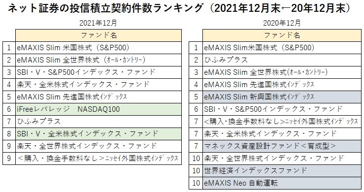 大手ネット証券3社の投信積立契約件数ランキング(月次、21年12月)では、トップ3は「eMAXIS Slim 米国株式(S&P500)」、「eMAXIS Slim 全世界株式(オール・カントリー)」、「SBI・V・S&P500インデックス・ファンド」の順で前月と変動はなかった。「eMAXIS Slim 米国株式(S&P500)」は2020年2月にトップに立ってから、23カ月連続でトップに居座り続けている。また、3位の「SBI・V・S&P500インデックス・ファンド」、4位の「楽天・全米株式インデックス・ファンド」、6位の「iFreeレバレッジ NASDAQ100」、8位の「SBI・V・全米株式インデックス・ファンド」と、トップ10のうち5本を単独で米国株式に投資するインデックスファンドが占めた。投信の積立契約における米国株式選好の傾向が強まっている。 ランキングは、定期的に月次の投信積立契約件数トップ10を公表しているSBI証券、楽天証券、マネックス証券の公開情報を使用。各社ランキング1位に10点、以下、順位が落ちるたびに1点を減点し、第10位を1点として、3社のランキング10位までのファンドの点数を集計した。 「eMAXIS Slim 米国株式(S&P500)」は、米国の代表的な株価指数である「S&P500」に連動することをめざすインデックスファンドだ。業界最低水準の信託報酬率をめざす「eMAXIS Slim」シリーズを代表するファンドであり、残高は1月5日現在で約9614億円となり、20年12月末の2289億円から1年間で4倍以上に残高を拡大した。同ファンドの基準価額は21年12月末まで1年間でプラス44.52%と大幅な上昇を記録した。21年に70回も史上最高値更新を記録した「S&P500」指数の上昇と、1年間に進んだ円安ドル高(20年12月末に1ドル=103円が21年12月末は1ドル=115円に)の効果がダブルで効いた。 このS&P500の高パフォーマンスは、NASDAQ上場の時価総額上位100銘柄で構成される「NASDAQ100」指数の日々の変動に2倍の動きをする「iFreeレバレッジNASDAQ100」や米国上場の約4000銘柄に投資する「CRSP USトータル・マーケット・インデックス(円換算ベース)」に連動する「楽天・全米株式インデックス・ファンド」、「SBI・V・全米株式インデックス・ファンド」の人気にもつながっている。 過去1年間の変化を見ると、20年12月末にはトップ10の5銘柄を「eMAXIS Slim」シリーズが占めていた。同シリーズが業界最低水準の手数料率をめざして競合ファンドで信託報酬が低いファンドが現れると、信託報酬率を引き下げて業界最低水準をキープする動きが明確に意識されるようになり、「インデックスファンドといえばeMAXIS Slim」といえるような状況ができていた。その後、業界最低水準の手数料率をめざすという路線で頭角を現してきたのが「SBI・V」シリーズだ。20年12月当時は「SBI・V・S&P500インデックス・ファンド」がランクインするくらいだったが、21年12月には「SBI・V・全米株式インデックス・ファンド」もランクインしてトップ10に2本を送り込んだ。 また、21年12月のトップ10には、「iFreeレバレッジ NASDAQ100」が入っている。オーソドックスなインデックスファンドが上位を占める投信積立契約ランキングにあって、株価指数の値動きの2倍の比率で値動きするようにレバレッジ(テコの原理)を効かせた運用を行うリスクの高いファンドだ。「NASDAQ100」の過去の値動きが長期にわたって大きく成長したことを頼りに、積立投資で長期に高いリターンを狙おうという投資家の支持を集めている。 一方、過去1年間の間にトップ10から姿を消したのは「eMAXIS Slim 新興国株式インデックス」、「マネックス資産設計ファンド<育成型>」、「世界経済インデックスファンド」、「eMAXIS Neo 自動運転」の4ファンドになる。このうち、「世界経済インデックスファンド」と「eMAXIS Neo 自動運転」は証券3社のそれぞれのトップ10からも姿を消している。積立投資は1年程度の短い期間ではなく、10年、20年と継続して長く続けることによって、その効果が発揮される運用方法といえる。わずか1年間程度の成績の優劣等によって、投資対象から外されてしまうのは非常に残念な結果といえる。 「世界経済インデックスファンド」は、世界各国の株式市場をGDPの比率に応じて分散投資する仕組みで世界全体の成長に投資するという明確な指針があるファンドだが、信託報酬率が年0.55%(税込)であり、年0.2%を下回るファンドが主流となっているインデックスファンド群の中ではやや割高感が感じられるのかもしれない。また、「eMAXIS Neo 自動運転」は、文字通り自動運転関連企業に投資するテーマ型のインデックスファンドだ。自動運転関連産業の成長は、現在進行形の成長テーマではあるものの、現在のパフォーマンスでは「eMAXIS Neo バーチャルリアリティ」には劣るなど、常に高い運用成績を維持し続けることはできないという弱点がある。長期の積立投資は「オーソドックスなインデックスファンドで」という点を改めて考えさせられるようなランキングの変化が見て取れる。(表は、投信積立契約件数ランキング・トップ10の1年間の変化)