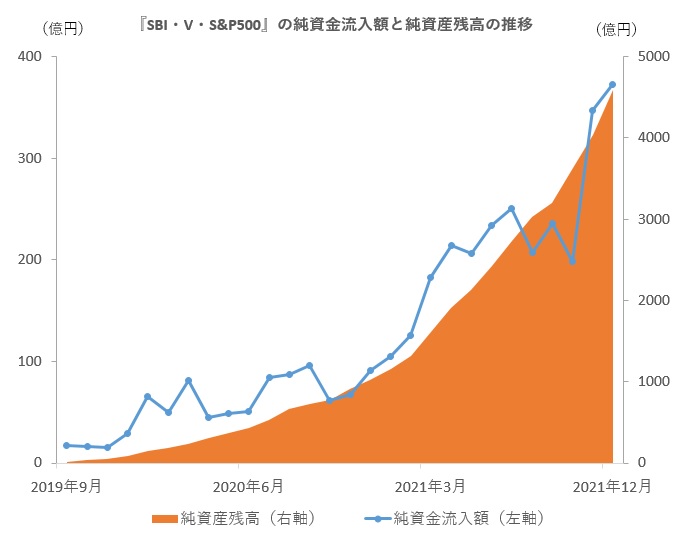 SBIアセットマネジメントの「SBI・V・S&P500インデックス・ファンド」(愛称:SBI・V・S&P500)への資金流入が加速している。ウエルスアドバイザーの推計によると、2021年12月の純資金流入額は372億円と2カ月連続で設定(2019年9月)来の最大を更新した。個別全ファンドの純資金流入額ランキングにおいても、2カ月連続で第5位となった。 同ファンドは、米国バンガード社のETFを組み入れた低コストインデックスファンドシリーズ「SBI・Vシリーズ」3本のうちの1つ。シリーズの中で設定が最も古く、純資産残高が最大の旗艦ファンドである。 設定から2021年12月まで28カ月連続で純資金流入となっている。2021年1月に単月の純資金流入額が100億円を超えてからは、高水準での資金流入が継続している。2021年は年間で2679億円の純資金流入となり、12月を含めた8カ月で純資金流入額が設定来最大を更新した。 同ファンドは、投資先ETFの信託報酬も含めた実質的な信託報酬等(税込)が年0.0938%程度と、米国株式に投資するインデックスファンド(ETF除く)の中で最安である。また、つみたてNISAの対象ファンドでもある。NYダウ、S&P500が昨年末に最高値を更新するなど米国株式が堅調に推移する中、投資家の資金流入ピッチが加速した。 資金流入増加と米国株高を背景に純資産残高も増加している。2021年11月24日に4000億円を突破し、2022年1月6日時点は4611億円となっている。 「SBI・V・全米株式インデックス・ファンド」(愛称:SBI・V・全米株式)、「SBI・V・米国高配当株式インデックス・ファンド」(愛称:SBI・V・米国高配当株式)も2021年6月の設定から7カ月連続で純資金流入。シリーズ3ファンド合計の純資産残高は2022年1月6日時点で5187億円となっている。 2022年1月31日にはシリーズ4本目となる「SBI・V・全世界株式インデックス・ファンド」(愛称:SBI・V・全世界株式)の新規設定が予定されている。