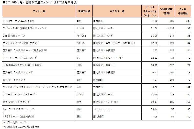 21年12月末時点で過去5年間(60カ月、2017年1月〜2021年12月)連続でファンドレーティングが5ツ星(★★★★★)となった国内アクティブファンドを確認したところ、14ファンドが該当した。前月末までの12ファンドに2ファンドが新たに加わった。 ウエルスアドバイザーでは、運用期間3年以上のファンドを対象に、毎月上旬に前月末時点のファンドレーティングを公表している。レーティングとは、ファンドのリスクを加味したリターンが、その属するウエルスアドバイザーカテゴリーにおいてどの水準にあるのかを、5段階で示したもの。最上位の5ツ星は、カテゴリー内で最も運用効率に優れた水準にあることを示す。5年連続5ツ星ファンドは、運用効率が長期にわたって優れていることを示す。 今回新たに加わったのは、「野村 ワールドスターオープン」と「J−REITオープン(資産成長型)」。いずれも野村アセットマネジメントのファンドである。 「野村 ワールドスターオープン」は、世界各国の株式及び債券を実質的な主要投資対象とする。運用に際しては、各国の成長性・成熟度のほか、世界各地域の資本市場間の需給動向・売買動向など資金フローの動向、各国の景気サイクル、株式市場をけん引するテーマや投資対象などに留意する。先物・オプションなどデリバティブ及びスワップ取引を適宜活用する。投資信託協会の商品分類では特殊型(ロング・ショート型)となっている。21年12月末時点のトータルリターンは、過去1年間、3年間(年率)、5年間(年率)、10年間(年率)の全てでウエルスアドバイザーカテゴリー「ヘッジファンド」内でトップ。過去5年間は15.14%とカテゴリー平均を13.16%上回り、カテゴリー50本中でトップとなった。 「J−REITオープン(資産成長型)」は、流動性や収益性・成長性などから選択したJ−REITに分散投資し、高水準の配当収益と中長期的な値上がり益の獲得を目指す。シリーズは「毎月決算型」、「年4回決算型」と合わせて3ファンドからなる。「年4回決算型」は、現行のレーティングの付与が始まった10年7月から21年12月まで138カ月連続で5ツ星を獲得している。「資産成長型」の21年12月末時点の過去5年間のトータルリターン(年率)は7.05%とカテゴリー「国内REIT」平均を1.40%上回り、カテゴリー内上位9%(111本中9位)となっている。 連続5ツ星期間の長い5ファンドを見ると、すでに触れた138カ月連続の「J−REITオープン(年4回決算型)」を始め、93カ月連続の「スパークス・新・国際優良日本株ファンド」(愛称:厳選投資)、85カ月連続の「One 国内株オープン」(愛称:自由演技)、84カ月連続の「フィデリティ・アジア株・ファンド」と「明治安田 日本債券オープン(毎月決算型)」(愛称:しあわせ宣言(毎月決算型))となった。