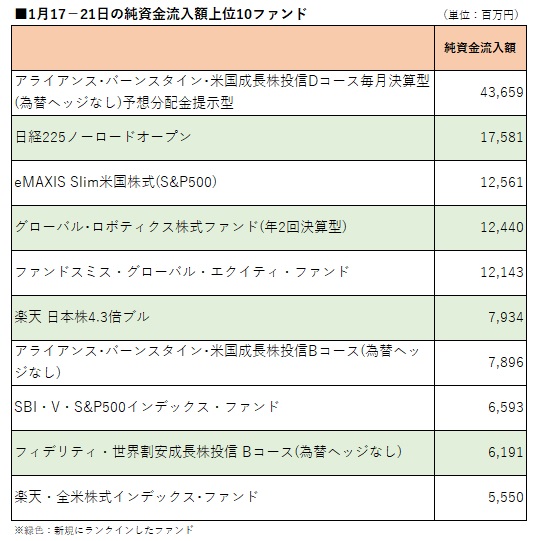 国内公募追加型株式投信(確定拠出年金専用、ファンドラップ専用、及びETF除く)を対象として、ウエルスアドバイザー推計値に基づいて先週(2022年1月17−21日)の純資金流入額上位10ファンドを確認したところ、「アライアンス・バーンスタイン・米国成長株投信」の「Dコース毎月決算型(為替ヘッジなし)予想分配金提示型」(AB・米国成長株投信Dコース(H無)予想分配金)が2週連続のトップとなった。純資金流入額は437億円で、2021年9月13−17日の409億円を上回り、同ファンドの週次の純資金流入額としては、2020年以降で最大となった。 このほかには、同シリーズの「Bコース(為替ヘッジなし)」、「eMAXIS Slim米国株式(S&P500)」、「ファンドスミス・グローバル・エクイティ・ファンド」、「SBI・V・S&P500インデックス・ファンド」(愛称:SBI・V・S&P500)、「楽天・全米株式インデックス・ファンド」(愛称:楽天・バンガード・ファンド(全米株式))が先々週(2022年1月11−14日)に続いてトップ10入りした。 先週トップ10内に返り咲いたのは4ファンド。「日経225ノーロードオープン」と「楽天 日本株4.3倍ブル」が、国内株式の急落と買戻しの動きの中での資金流入により、2021年11月29日−12月3日以来のランクインとなったほか、「フィデリティ・世界割安成長株投信 Bコース(為替ヘッジなし)」(愛称:テンバガー・ハンター)が同12月13−17日以来、「グローバル・ロボティクス株式ファンド(年2回決算型)」が同7月26−30日以来のランクインとなった。 一方、先々週ランクインしていたファンドのうち、「eMAXIS Slim全世界株式(オール・カントリー)」、「三井住友・DCつみたてNISA・全海外株インデックスファンド」、「米国ネクストビジョンファンド(為替ヘッジなし)」、「投資のソムリエ」がトップ10圏外となった。