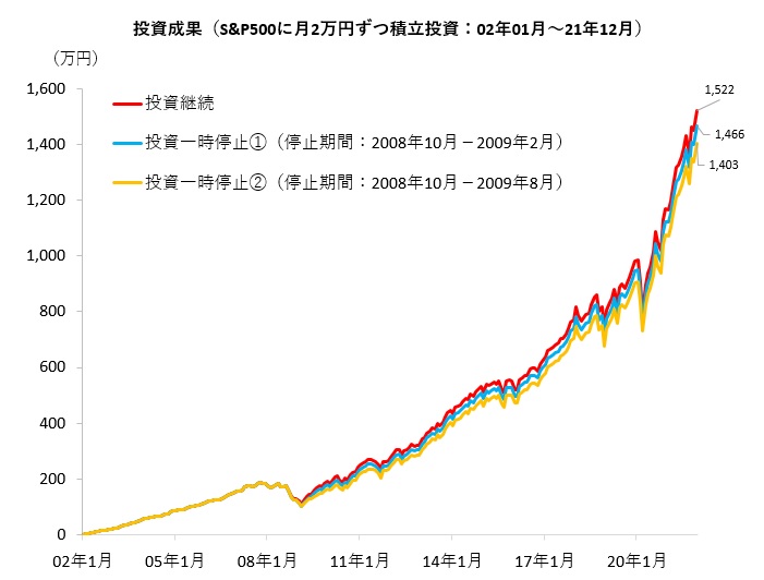 日米株安が止まらない。米国で26日まで開かれていたFOMC(米連邦公開市場委員会)で、FRB(米連邦準備制度理事会)の金融引き締めに積極的なタカ派色の強まりが確認され、警戒感が広がっている。同日のNYダウは続落し、27日の日経平均株価は大幅に3日続落して、連日の昨年来安値となった。3月の米利上げ開始方針は予想されていたものの、今後の利上げペースや保有資産縮小の開始時期などは不透明で、市場の不安心理は簡単には解消しそうにない。ウクライナ情勢も緊迫している。今後、一段の下落が起きないとも限らない。 2002年1月から2021年12月までの20年間、毎月2万円を米S&P500に積立投資したシミュレーションを行った。シミュレーションを通して、株価大幅下落時における「長期・積立」の効果を改めて確認したい。 シミュレーションでは、期間中投資を継続した「投資継続」、2008年10月から2009年2月まで投資を停止して翌3月から再開した「投資一時停止?」、2008年10月から2009年8月まで投資を停止して翌9月から再開した「投資一時停止?」の3パターンを実施した。投資停止を2008年10月からとしたのは、同月がリーマンショックの発生した同年9月の急落に続いて大幅続落し、対象期間20年間(240カ月)において下落率が最大となったためである。「投資一時停止?」では、リーマンショック時の最安値であり対象期間中の最安値をつけた2009年2月まで停止した。「投資一時停止?」では2009年8月まで停止したが、同月に、リーマンショック発生前の2008年8月から最安値2009年2月にかけての下落幅の半値戻しを達成したことによる(なお、最安値は月末時点をベースとしている。日次ベースでは2009年3月に記録している)。 2021年12月末時点の評価額を確認すると、「投資継続」が1522万円(投資額480万円の約3.2倍)、「投資一時停止?」が1466万円(投資額470万円の約3.1倍)、「投資一時停止?」が1403万円(投資額458万円の約3.1倍)となった。対象期間のS&P500が概ね右肩上がりであったことから、いずれも投資額を大幅に上回る評価額となったが、「投資継続」が最も良好で、「投資一時停止?」を56万円、「投資一時停止?」を119万円上回った。 リーマンショック前の2008年8月から最安値2009年2月までの下落率は42.7%に達する。急落による評価損を耐える心理的負担は大きいが、下落時においても定額で粛々と積立投資を続けたことが、その後の株価反転と上昇による恩恵をより多く受ける結果となった。「投資一時停止?」においては、最安値を付けた直後に投資を再開したため、その後の株価反転の恩恵を比較的多めに受けられる結果となった。ただ、リーマンショックのような場合において、底打ちを的確につかむのは難しく、投資再開に際しては、「投資一時停止?」のように半値戻しを確認したいというパターンが、実際には多いと思われる。なお、2008年10月で損切した場合には、27万円余りの損が確定する。投資を一時停止しても再開すれば評価益を獲得できたが、停止することなく一貫して投資を継続した方がさらに評価益が膨らんだ。 急落時には評価損が発生することもあるが、投資期間が長期であるほど、損失を取り返す可能性も高まる。年配の方の場合は損切を検討した方が良い場合もあるが、投資期間が長い場合は積立投資を継続するよう意識したい。