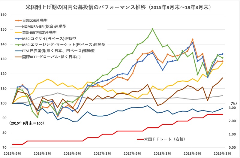 米国金融当局の金融引き締め姿勢が当初の予想よりも厳しいという見方が優勢となり、米国株価の調整が続いている。1月26日に行われたバウエルFRB議長の記者会見で、3月上旬までに量的緩和を終了するとともに、利上げを行うことを明らかにしている。概ね事前に予想されていた結果といえるが、米国株価は神経質に動いており、下押し圧力が強い印象を受ける。米国の利上げ開始時には、前回2015年12月からの利上げ時に株安に反応したこともあり、米国株が高値から下落している動きは自然な反応といえる。ただ、株安の期間は数カ月で終了し、その後は株高に転じている。過去の動きを振り返って、先々を見通した対応をしたい。 国内公募投信の動きを表す「ウエルスアドバイザーインデックス」を使って、前回の利上げ前の2015年9月末から、FFレートの水準が2.50%でピークを付けた18年12月を経て19年3月末までの投資対象資産別の動きを振り返ってみた。「日経225連動型」は日経平均株価に連動するインデックスファンド群の単純平均の動きを示す。「NOMURA−BPI(総合)連動型」は国内債券インデックスファンド、そして、「東証REIT指数連動型」は国内REITのインデックスファンドだ。先進国株式(除く日本)のインデックスファンドの「MSCIコクサイ(円ベース)連動型」、新興国株式インデックスファンドの「MSCIエマージング・マーケット(円ベース)連動型」、先進国(除く日本)の国債インデックスである「FTSE世界国債(除く日本、円ベース)連動型」、日本を除く先進国REITファンド(為替ヘッジなし)の単純平均である「国際REIT・グローバル・除く日本(F)」を検証対象にした。 その結果、国内株式、先進国株式、新興国株式のインデックスファンドは、15年12月の利上げ開始の直前月(15年11月)に付けた高値から4カ月にわたって下落した。高値からの下落率は月末ベースで、国内株式は17.40%、先進国株式が14.73%、新興国株式が16.71%だった。その後、一旦反発し、2番底を付けた後に大きな上昇相場に転じている。利上げ直前の高値から、2番底をつけるのは7カ月後だった。この2番底の水準から、株価上昇の第1波である2018年1月末(2番底から19カ月目)の高値まで、国内株式は48.88%、先進国株式は46.19%、新興国株式は62.34%も値上がりした。この1年半の間、ほとんど下げらしい下げはなかった。 つまり、株式ファンドを持っていて、利上げ開始による株価の下落を嫌って、一旦は売却したとしても、数カ月間の低迷期に買い戻さなければ、買おうと思っても毎月値上がりする株価を追いかけて高値で購入することになってしまう。一旦現金化して下落リスクを回避しようと動くことの価値はあまりないのではないだろうか。むしろ、買い直すタイミングを逸して株高による収益機会を減じてしまう恐れがある。 実は、2016年6月の2番底は、英国国民選挙によって英国がEU離脱(ブレグジット)を決めた極めて大きなイベントが起こったための下落だった。追い打ちをかけるように、同年11月には政治家としての力量がまるで分らないトランプ大統領が大統領選で選出された。「混乱の予兆しかしない」といえる局面だったといえよう。このような外部環境であったにもかかわらず、株価は国内外問わず世界的に堅調だった。 現在、ロシアがウクライナ国境に大規模な軍隊を送り込み、米国を中心としたNATO(北大西洋条約機構)の東方拡大の動きを封じるためにウクライナ侵攻の危機にあるといわれている。未だ終息したとは言い難い新型コロナ・パンデミックの動きからも目を離せない。現在抱えている問題が大きく世界経済を揺さぶれば、年内に3回ないしは4回と予想されている米国の利上げ回数は実現しない可能性もある。2016年当時に英国のブレグジットはありえないと考えられた。米国が利上げの2回目の実施を16年12月まで見送ったのは、想定以上の混乱があったためだろう。 ただ、2回目の利上げが実施されて以降は、2016年当時は株価が順調な値上がりを続けている。計画的な利上げが実施できることは、それだけ経済が強くしっかりしている証ともいえるからだろう。 一方で、株式以外の資産は、この利上げ局面にあっては、あまり良い投資対象とはいえなかった。米国の利上げが逆風になる「先進国国債」は利上げ期間を通じて低迷し続けた。また、「国内REIT」や「国内債券」は米国の利上げ当初こそ値上がりしたが、その後は冴えない展開になった。「先進国REIT」も概ね横ばいであり、株式ほどに明確な上昇になっていない。 現在、株式ファンドを保有している人の多くは、米国の利上げをきっかけに起こった変調に戸惑い、一刻も早く株式ファンドを売却し、現金化したいという誘惑にかられているのではないだろうか。1日に3%程度も株価が動けば、安心しろという方がおかしいと感じているだろう。しかし、前回の利上げ局面で、株式への投資が大きく報われた事実がある。株価下落のきっかけの1つとされるパウエルFRB議長の会見でも、米国経