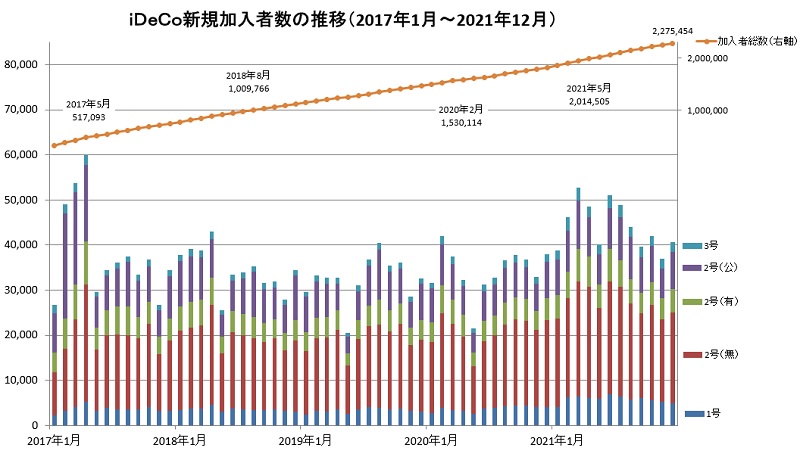 国民年金基金連合会が2月1日に発表したiDeCo(イデコ、個人型確定拠出年金)の業務状況によると、12月の新規加入者数は4万583人で加入者総数は227万5454人になった。月間の新規加入者は、前月の3.7万人の落ち込みを挽回し、再び4万人の大台を回復した。なお、従業員のiDeCoに企業が上乗せ拠出をするiDeCo+(中小事業主掛金納付制度)は、実施事業所数は3843事業所、対象従業員数は2万4165人になった。 12月の新規加入者の内訳は、第2号加入者は3万3516人(前月2万9536人)、第3号加入者は2143人(前月2212人)となった。なお、第2号加入者の中では、企業年金なしの新規加入者が2万49人(前月1万8291人)。共済組合員(公務員)の新規加入者は8215人(前月6560人)となった。 厚生労働省が1月21日に発表した「令和4年度の年金額改定」によると、今年4月分(6月支払い分)からの年金額は、国民年金(老齢基礎年金)の満額で月額6万4816円となり、これまでの6万5075円から0.40%(259円)の減額になる。減額は前年度から2年連続で、前年度の0.10%減額よりも大きな減額率になった。これによって、令和2年度の支給額である月額6万5141円と比較すると、月額で325円減額されることになる。 公的年金の支給額は、年金額の改定ルールにのっとって決定されている。たとえば、名目手取り賃金変動率がマイナスで名目手取り賃金変動率が物価変動率を下回る場合、年金を受給し始める際の年金額(新規裁定年金)、受給中の年金額(既裁定年金)ともに、名目手取り賃金変動率を用いることが法律で定められている。令和4年度の年金額は、名目手取り賃金変動率がマイナス0.40%であったため、その水準と同じだけ減額されることになる。「名目手取り賃金変動率」は、2年度前から4年度前までの3年度平均の実質賃金変動率に前年の物価変動率と可処分所得割合変化率(0.0%)を加えて計算される。 そして、将来世代の年金受給をより確かなものにするために設けられている「マクロ経済スライド」は、賃金や物価による改定率がマイナスの場合は調整を行わず、翌年度以降に繰り越されるため、本来はマイナス0.2%の調整(2年度前から4年度前までの3年度平均公的年金被保険者数の変動率0.1%+平均寿命の伸び率マイナス0.3%=マイナス0.2%)は、前年度のマイナス0.1%と加えて合計マイナス0.3%が繰り越されることになる。 このように公的年金の支給額は、ルールに従って毎年改定されているが、iDeCoの加入対象者が公務員や第3号被保険者にまで拡大された2017年1月以降の改定を振り返ると、2017年度はマイナス0.10%、18年度は変わらず、19年度はプラス0.10%、20年度はプラス0.21%で2年連続で増額改定となり、21年度から22年度にかけて2年連続でマイナス改定になる。iDeCoの新規加入者の増加数を振り返ってみると、18年度から20年度まで公的年金支給額がプラス方向で改定された期間は、加入者数の増大が抑えられ、21年度のように公的年金が減額された期間にはiDeCoへの加入者が増大する傾向がある。 iDeCoは、公的年金を補完する役割が期待される制度だけに、公的年金の支給額の動向が新規加入には大きな影響力があるということだろう。今回、2年連続のマイナス改定という厳しい結果になり、しかも、マクロ経済スライドでマイナス0.3%が先送りされていることを考え合わせれば来年度以降の改定も増額期待が持ちづらく、iDeCoへの加入意欲は一段と高まると考えられる。今後の動向を注意深く追っていきたい。(図版は、iDeCo新規加入者の推移)