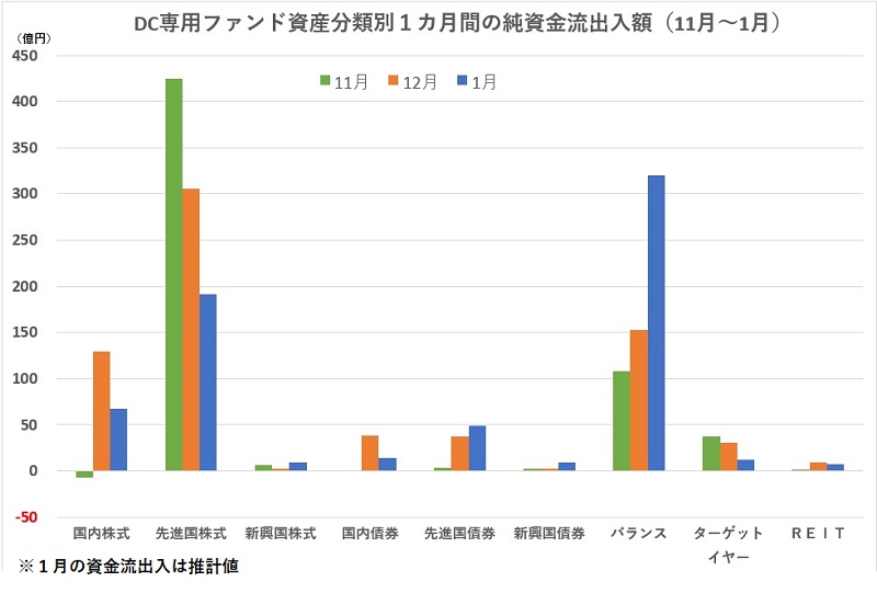 DC専用ファンドの2022年1月の純資金流出入額は約681億円の流入超過になった。資金流入超過は2020年12月以降14カ月連続になった。バランスが約320億円の資金流入額となり、前月の約152億円の資金流入額から倍増し、資産別でトップの資金流入になった。また、先進国株式が約191億円の資金流入額で前月の約306億円の資金流入額からは減少したものの、依然として大きな資金流入が続いている。前月に続いて全ての資産クラスが資金流入となった。 DC専用ファンド全体の純資産総額は約8兆4383億円と前月から約3288億円減少した。21年12月末比で22年1月末に米国株式のS&P500(配当込み、円ベース)がマイナス7.11%、先進国株式の代表的なインデックスであるMSCIワールド(配当込み、円ベース)がマイナス6.92%、国内株式のTOPIX(配当込み)がマイナス4.83%など、主要国の株価が大きく下落した影響を受けた。資産配分状況は、株式ファンド46%、債券ファンド17%、バランスファンド35%という割合で、前月と比較して株式ファンドが1%ポイント低下し、バランスが1%ポイント増加した。(※個別のDC規約では、DC専用ファンド以外のファンドを制度に採用している場合があるため、DC専用ファンド全体の純資産総額は、国内DC制度全体で運用されているファンドの残高とは一致しない) ■資金流入額トップは「投資のソムリエ<DC年金>」 DC専用ファンドの過去1カ月間の純資金流入額ランキングは、トップが「投資のソムリエ<DC年金>リスク抑制型」、第2位が「投資のソムリエ<DC年金>」になった。資金流入額は2ファンド合計で約143億円になった。第3位以下は「One DC先進国インデックスファンド」など、第7位まで先進国インデックスファンドが占めた。前月は、「野村 外国株式インデックスF(確定拠出年金)」を筆頭にトップ4を先進国株式インデックスファンドが占めたが、今月も引き続き先進国株式インデックスファンドが優位な状況が続いている。第10位には、DC市場における代表的なバランスファンドである「インデックスコレクション(バランス株式30)」が入った。 資金流入額でトップになった「投資のソムリエ<DC年金>リスク抑制型」は、国内外の株式や公社債、リート(不動産投信)を投資対象とし、目標リスクを年2%程度に設定して資産配分比率を毎月見直すとともに、日々の環境変化に応じて機動的に資産配分比率を見直している。第2位の「投資のソムリエ<DC年金>」は、目標とするリスク水準が年4%程度とやや高いが、基本的な運用の仕組みは同じだ。 たとえば、21年11月下旬に新型コロナの変異種であるオミクロン株が発見され、非常に強い感染力があることが明らかになると、11月29日にリスク性資産を「警戒局面」に引き下げ、12月1日には「危機局面」として一段と引下げ、12月7日に「警戒局面」に戻すという対応を実施している。12月7日時点でのリスク性資産(株式やリートなど)の組入比率は3.6%、現金等の比率を16.0%にまで引き上げている。このように、株式等の下落が強く懸念される局面では、リスク性資産の組入れ比率を大幅に引き下げることによって株価等の下落による資産価値の目減りを防いでいる。この判断は、経済指標等の変化を分析してシステマチックに行うようにしている。 2012年10月に公募投信である「投資のソムリエ」を設定して以来、9年超の運用実績があるが、リスク・リターンともに、非常に安定した運用成績を残してきている。13年10月に設定した「投資のソムリエ<DC年金>」の過去5年(年率)のリスクは2.73%、トータルリターン(年率)は2.66%、15年10月に設定した「投資のソムリエ<DC年金>リスク抑制型」の5年(年率)リスクは2.29%、トータルリターン(年率)は1.91%になっている(2022年1月末現在)。この安定した運用成績が、市場の先行きに不透明感が強まった中で支持されたと考えられる。 ■トータルリターンは「DCトヨタ自動車/トヨタグループ株式ファンド」 個別ファンドの過去1年間のトータルリターンランキングトップは、「DCトヨタ自動車/トヨタグループ株式ファンド」の38.21%だった。前月のトップだった「DCダイワ・グローバルREITインデックス」は3位に後退し、前月7位だった「DCダイワ・グローバルREITアクティブ」が第2位に浮上した。前月同様に先進国REITを主たる投資対象としたファンドがランキングの第2位から第9位を占めた。第10位には「野村世界ESG株式インデックス(確定拠出年金)」が入った。 「DCトヨタ自動車/トヨタグループ株式ファンド」は、ファンド名の通り、トヨタ自動車とそのグループ会社(連結子会社、持分法適用関連会社)を投資対象とし、トヨタ自動車に50%、グループ会社は時価総額に応じた比率で投資する。コロナ禍に伴う半導体不足や部材の調達困難などサプライチェーンが滞ったことで、多くの製造業で生産効率が悪くなり減産などを余儀なくされる中、トヨタグループは減産回避の努力によってトヨタ自動車の中間決算(21年9月期)売上高は15兆4812億円、純利益は1兆5244億円と過去最高を更新した。この決