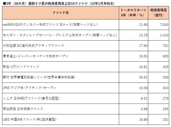 国内アクティブファンド(確定拠出年金専用、ファンドラップ専用、ETF除く)の中で22年1月末時点までの過去3年間(19年2月末〜22年1月末)にかけてファンドレーティングが連続して5ツ星(★★★★★)であったファンドは26本あった。前月末時点から2ファンドが外れる一方で、新たに2ファンドが到達した。 ウエルスアドバイザーでは、運用期間3年以上のファンドを対象にレーティングを公表している。レーティングは、ファンドのリスク調整後のリターンがその属するカテゴリーの中でどの水準にあるかを5段階で示したものである。最上位の5ツ星は相対的な運用効率に優れていることを示す。 今回新たに3年連続5ツ星に加わったのは、JPモルガン・アセット・マネジメントの「JPM アジア株・アクティブ・オープン」と三菱UFJ国際投信の「モルガン・スタンレーグローバル・プレミアム株式オープン(為替ヘッジなし)」。このうち、「モルガン・スタンレーグローバル・プレミアム株式オープン(為替ヘッジなし)」はウエルスアドバイザーが10日に発表した「ファンド オブ ザ イヤー2021」において、「国際株式型(グローバル・除く日本)部門」の「優秀ファンド賞」を受賞した。 「JPM アジア株・アクティブ・オープン」は日本を除くアジア各国の企業の株式を主要投資対象とする。具体的には、「MSCI AC ファーイースト・インデックス(除く日本、配当なし、円ベース)」をベンチマークとし、ベンチマーク構成国の企業の中から成長性があり株価が割安と判断した銘柄に投資する。21年11月末時点のベンチマーク構成国は、中国、香港、台湾、韓国、シンガポール、マレーシア、タイ、インドネシア、フィリピンとなっている。22年1月末時点のポートフォリオを見ると、国・地域別組入比率上位は中国36.1%、台湾21.8%、韓国13.0%、業種別上位は半導体・半導体製造装置16.1%、銀行13.1%、メディア・娯楽13.0%となっている。 22年1月末時点の過去5年間のトータルリターン(年率)は15.09%とウエルスアドバイザーカテゴリー「国際株式・エマージング・複数国(為替ヘッジなし)」平均を9.02%上回り、カテゴリー内上位2%(131本中2位)となっている。 「モルガン・スタンレーグローバル・プレミアム株式オープン(為替ヘッジなし)」は世界の企業の中から、高いブランド力、有力な特許、強固な販売網などを裏付けとして持続的にフリー・キャッシュフローを増大させることが見込まれるプレミアム企業に投資する。実質的な運用は、英国ロンドンにあるモルガン・スタンレー・インベストメント・マネジメント・リミテッド(モルガン・スタンレー・インベストメント・マネジメントの欧州拠点)が手掛ける。21年12月末時点のポートフォリオの国・地域別比率上位は、米国73.8%、英国9.9%、フランス5.6%。組入銘柄数は32で、組入上位銘柄は、ソフトウエア世界大手の米『マイクロソフト』9.2%、たばこ大手の米『フィリップ・モリス・インターナショナル』7.4%、欧州日用品大手の英『レキットベンキーザー・グループ』6.3%となっている。 22年1月末時点の過去5年間のトータルリターン(年率)は13.78%とカテゴリー「国際株式・グローバル・除く日本(為替ヘッジなし)」平均を2.97%上回り、カテゴリー内上位17%(143本中23位)となっている。