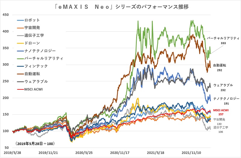 三菱UFJ国際投信が設定・運用している特定テーマに関連した銘柄群で作るインデックスファンド「eMAXIS Neo」シリーズに、新たに「コミュニケーションDX」と「水素エコノミー」が3月4日に新規設定される。同シリーズは、第4次産業革命の原動力となる技術群(テーマ)に沿う銘柄を選定する「S&P Kenshoニューエコノミー指数」の個別指数に連動する運用成果をめざすファンド群。これまで11ファンドが設定され、「バーチャルリアリティ」や「ウェアラブル」など、非常に優れたリターンをたたき出してきたシリーズだ。過去1年間は、高成長のハイテク銘柄に逆風となる環境になっているため、揃ってパフォーマンスは低調だが、いずれも将来性を感じさせる投資テーマとなっており、新ファンドにも注目したい。 新ファンドの「eMAXIS Neo コミュニケーションDX」は、エンタープライズ・コラボレーションに関連する次世代商品やサービスを提供することに従事している企業を構成銘柄にした「S&P Kensho Enterprise Collaboration Index」に連動した運用成績をめざす。同指数は、音声やビデオ、メッセージなどを企業内や企業をまたいで、リアルタイムで交換することに関連する機能やサービスを提供する企業群のパフォーマンスを測定できるように設計されている。新型コロナウイルスのパンデミック(世界的大流行)によって、リモートワークやビデオミーティングなどの活用は世界的な潮流になっている。 S&P社が出しているファクトシートによると、「S&P Kensho Enterprise Collaboration Index」は2022年1月末現在で過去3年間のトータルリターン(米ドル建て)が年率換算で44%、過去1年間で6.02%という成績になっている。暦年のリターンでは、2020年のトータルリターンが126.9%と極めて大きなリターンを記録している。 また、「eMAXIS Neo 水素エコノミー」は、「S&P Kensho Hydrogen Economy Index」への連動をめざす。同指数は、水素の生産、水素の貯蔵と輸送、燃料電池の設計と製造を専門とする企業を含む「水素経済」に焦点を当てた企業のパフォーマンスを測定するように設計されている。リチウムイオン電池を動力源とした現在主流のEV(電気自動車)の次の世代のグリーン自動車として注目されている燃料電池車(FCV)などで活用される「水素」を真正面から捉えた商品といえ、ESG(環境・社会・企業統治)投資の面からも注目される。同じくファクトシートによると、過去3年のトータルリターンは年率29.93%、過去1年はマイナス32.62%だ。信託報酬は税込み年0.792%とシリーズ同一になっている。 「eMAXIS Neo」シリーズは、限定的な投資テーマを対象としているため、社会的な関心がそのテーマに向かっている時には、非常に大きなパフォーマンスを出すことができるが、全てのテーマが等しく注目されるというものではない。シリーズは、2018年8月に設定された「eMAXIS Neo ロボット」、「eMAXIS Neo 宇宙開発」、「eMAXIS Neo 遺伝子工学」から、2021年5月に設定された「eMAXIS Neo クリーンテック」、「eMAXIS Neo 電気自動車」まで11ファンドが運用されている。その中で2年以上の運用実績のある9ファンドのパフォーマンスを調べると、「全世界株式インデックス(MSCIオール・カントリー・ワールド・インデックス(ACWI)(配当込み、円ベース)」(トータルリターン2年・年率17.23%)と比較すると、22年1月末時点で「バーチャルリアリティ」(同51.34%)、「自動運転」(同45.89%)、「ウェアラブル」(31.83%)、「ナノテクノロジー」(27.82%)の4ファンドは高いリターンをあげているが、残り5ファンドは全世界株インデックスに負けている。「遺伝子工学」のトータルリターン2年(年率)は0.54%という結果だった。 同ファンドシリーズは、それぞれの投資テーマがその時々の投資環境にフィットするかどうかによってパフォーマンスに差異が出る。これからの経済の行方をイメージして、どのような新しいサービスが人々のニーズに適っているのかということを考えてファンドを選ぶ楽しみがある。新ファンド2つの追加によって、選択肢が広がったことは、投資家にとってプラスになるといえるだろう。(グラフは、「eMAXIS Neo」シリーズで2年以上運用実績のある9ファンドのパフォーマンス推移)