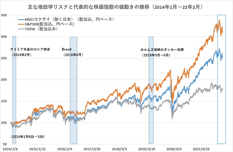 ウクライナ情勢の緊迫化を受けて2月17日のNYダウは622ドル安(マイナス1.78%)という今年最大の下落幅を記録した。いわゆる「地政学リスク」(特定地域が抱える政治的や軍事的、社会的な緊張の高まり)が意識され、ウクライナ国境に展開するロシア軍に関する情報で株価が大きく揺れる展開になっている。一般的には、「地政学リスクで下落した局面は買い」といわれるが、2020年3月安値から株価が急速に値上がりした後だけに、武力衝突ショックによる値下がり幅の目安が判断しにくくもなっている。過去の地政学リスク局面を振り返って、今後の値動きの手掛かりとしたい。 ロシア軍がウクライナ国境に集結し、ウクライナ国内に侵攻する構えを見せたのは、2014年2月以来のことだ。当時は、ウクライナのクリミア自治共和国が住民投票の結果、「クリミア共和国」として独立し、ロシア連邦に併合されることになった。この動きの発端を、どこに求めるのか難しいが、ロシア軍が15万人規模の兵を動員してクリミア国境で軍事演習をしていると伝えられたが2月26日だった。そして、翌27日にはロシア軍がクリミア半島にある最高議会ビルなどを占拠する動きに発展し、3月11日にクリミア自治共和国最高議会とセヴァストポリ特別市が「独立宣言」を出した。3月16日に独立の可否を問う住民投票が行われ、投票者の約9割といわれる圧倒的な独立支持が表明された。これを受け、ロシアは3月17日に「クリミア共和国」の独立を承認し、翌18日にクリミア共和国のロシア連邦への併合に関する条約を締結している。 この2014年のロシア軍のウクライナ侵攻の折に、世界の株式市場は、ほとんど反応をしなかった。ありていにいえばロシアが武力でウクライナからクリミア半島を奪い取ったことになるのだが、世界の市場は平穏だった。たとえば、世界株式の代表的な指標である「MSCIコクサイ(日本除く)(配当込み、円ベース)」はロシア軍が国境に集結した2月26日から、クリミアを併合した3月18日まで横ばいだった。プラスマイナス2%程度の値動きしかない。2月26日を基準にすると、ロシア軍がクリミアに侵攻した27日はほぼ変わらず、その後、3月7日には2%上昇し、クリミアで住民投票が行われた3月16日の翌営業日の17日には前週末比でマイナス0.84%の下落になったが、さほど大きな下落ではない。 この動きは、米国株式の代表的な株価指数である「S&P500(配当込み、円ベース)」、国内株の「TOPIX(東証株価指数)(配当込み)」においても同様な傾向だ。この3指数の中では「TOPIX」の値動きが一番大きく、14年2月26日を基準にすると、最も下落率が大きくなったのはマイナス5.74%で、住民投票後の3月17日が安値になった。 一方、2016年6月の「Brexit(イギリスのEU欧州連合からの離脱)」も、地域の枠組みを変える大きな変化だった。6月23日に行われた国民投票の結果、51.9%がEU離脱を支持したとして英国はEUとの決別を決めた。ヨーロッパ全体に影響が及ぶ出来事だったこともあって、株式市場への影響は、決して小さいものではなかった。国民投票が行われる前の高値5月31日を基準に考えると、国民投票の結果が判明後の安値である6月28日の株価下落率は「MSCIコクサイ」が14.33%。「S&P500」は12.57%、「TOPIX」は結果が判明した6月24日に安値を付け、直近高値から12.71%下落した。その後、Brexit決定前の高値を取り戻したのは同年11月半ばなので、約5カ月間を要したことになる。 また、2019年5月と6月に、ホルムズ海峡で商船やタンカーが攻撃されるという事件が勃発し、その背景にイランとアメリカの間の確執があるといわれたが、この時には、株価はさほど大きな変動にならなかった。「MSCIコクサイ」の高値からの下落率は5.79%、「S&P500」は6.39%、「TOPIX」は3.59%だった。 今回のウクライナ問題の発端を、2021年12月10日に「ロシア外務省がNATOがこれ以上拡大しない確約や国境付近での軍事演習の停止を要求した」こととすると、その後の高値は今年1月5日が基準になろう。今年の安値までの下落率は、「MSCIコクサイ」が10.43%、「S&P500」が10.92%、「TOPIX」は9.65%だ。「Brexit」当時の下落率までは、まだ届いていないという見方もできるが、「Brexit」相当の下落率にとどいたという見方もできよう。「地政学リスク」については当然、その影響の及ぶ範囲や、影響度合いの大きさなどによって株式市場に与える大きさは異なる。このため、過去の危機を現在に当てはめることは難しいのだが、「Brexitの衝撃で株式市場が約13%下落した」というモノサシで、現在の10%程度の下落を評価することは可能だろう。 さらに、現在は、「3月に米国が0.5%(従来の0.25%の2倍)の利上げを行うかもしれない」という金融政策の大きな変換点にあることも忘れてはならない。2020年3月を底にして上昇に転じた株価の上昇率は、「S&P500」や「MSCIコクサイ」は、明らかに2014年から2019年までの株価上昇とは異なる急激な上昇になっている。この上昇率の背景にあるのが、「コロナ・ショック」で委縮した