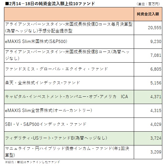 国内公募追加型株式投信(確定拠出年金専用、ファンドラップ専用、及びETF除く)を対象として、ウエルスアドバイザー推計値に基づいて先週(2022年2月14−18日)の純資金流入額上位10ファンドを確認したところ、キャピタル・インターナショナルの「キャピタル・インベストメント・カンパニー・オブ・アメリカ ICA」と、フィデリティ投信の「フィデリティ・USリート・ファンドB(為替ヘッジなし)」が新規にランクインした。両ファンドとも2021年以降で見て初めてのランクインとなる。 「キャピタル・インベストメント・カンパニー・オブ・アメリカ ICA」は、米国の取引所に上場している企業の株式を主要投資対象とする。銘柄選択に際しては、収益成長性や配当に着目する。2022年1月末時点のポートフォリオを見ると、組入銘柄数は179で、国・地域別構成比率は米国が86.9%でトップ、業種別構成比率上位は情報技術21.1%、コミュニケーション・サービス13.4%、ヘルスケア10.9%、組入銘柄上位は、ソフトウェア世界大手の米『マイクロソフト』8.0%、「フェイスブック」などを運用する米『メタ・プラットフォームズ』3.9%、米半導体メーカーの『ブロードコム』3.9%となっている。同月末時点の過去3年間のトータルリターンは17.99%とウエルスアドバイザーカテゴリー「国際株式・北米(為替ヘッジなし)」平均を2.65%上回り、カテゴリー内上位31%(198本中60位)となっている。 「フィデリティ・USリート・ファンドB(為替ヘッジなし)」は、米国の取引所に上場されているREITを主要投資対象とし、ファンドの利回りがベンチマーク「FTSE NAREIT Equity REITs インデックス(税引前配当金込/円ベース指数)」以上となることを目指す。長期的な潜在成長力が高いと判断したREITを選択する。2021年12月末時点の組入銘柄数は42で、組入比率上位は、物流関連の『プロロジス』9.8%、データセンター関連の『デジタル・リアルティー・トラスト』7.8%、ヘルスケア関連の『ウェルタワー』5.9%。2022年1月末時点の過去10年間のトータルリターンは13.57%でカテゴリー「国際REIT・特定地域(為替ヘッジなし)」平均を4.18%上回り、カテゴリー22本中第2位となっている。 先週の純資金流入額トップは「アライアンス・バーンスタイン・米国成長株投信」の「Dコース」。206億円の純資金流入となり、2週連続のトップとなった。同シリーズの「Bコース(為替ヘッジなし)」のほか、「eMAXIS Slim米国株式(S&P500)」、「ファンドスミス・グローバル・エクイティ・ファンド」、「楽天・全米株式インデックス・ファンド」(愛称:楽天・バンガード・ファンド(全米株式))、「eMAXIS Slim全世界株式(オール・カントリー)」、「SBI・V・S&P500インデックス・ファンド」(愛称:SBI・V・S&P500)、「マニュライフ・円ハイブリッド債券インカム・ファンド(年1回決算型)」が先々週(2022年2月7−10日)に続いてトップ10入りした。 一方、先々週ランクインしていたファンドのうち、「米国ネクストビジョンファンド(為替ヘッジなし)」、「netWIN GSテクノロジー株式ファンド Bコース(為替ヘッジなし)」がトップ10圏外となった。