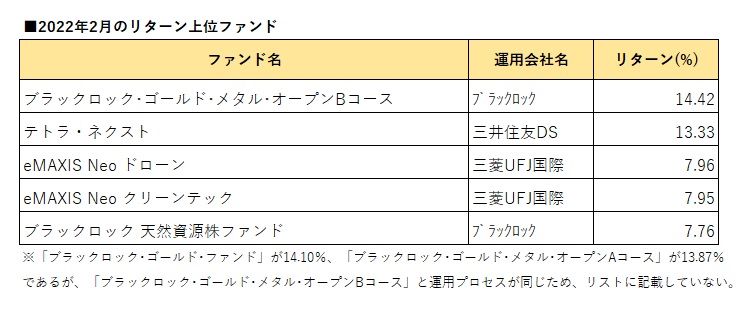 ロシアのウクライナ侵攻に金融市場が大揺れした2022年2月。国内ファンドのリターンランキングを確認したところ、金関連企業に投資するファンドがトップとなり、米新興国株式市場のトレンドへの追随を目指すファンドが続いた。 同月のリターンをウエルスアドバイザーカテゴリー別に見ると、「コモディテイ」が4.98%でトップ。第2位には1月にトップであった「国際株式・ブラジル(為替ヘッジなし)」が続いた。同月はNYダウが同▲3.53%、日経平均株価が同▲1.76%となるなど世界の株価が下落する中にあって、需給逼迫懸念からNY原油先物が同8.59%、リスク回避の動きにNY金先物が同5.81%上昇。ブラジルの代表的な株価指数であるボベスパ指数も同0.89%上昇と続伸した。 個別ファンド(ブルベア型、通貨選択型除く、同月末時点の純資産残高10億円以上)のリターンランキングでは、「ブラックロック・ゴールド・メタル・オープンBコース」が14.42%でトップとなった。同ファンドは、南アフリカ、オーストラリア、カナダ、アメリカなどの金鉱企業の株式を主要投資対象とし、各企業の金埋蔵量、産金コストなどを推計・分析して割安と判断した企業に厳選投資する。金価格の上昇がリターンに寄与した。また、同シリーズの「Aコース」が13.87%で第3位、運用プロセスが同じ「ブラックロック・ゴールド・ファンド」が14.10%で第2位となった。 「テトラ・ネクスト」が13.33%、「eMAXIS Neo ドローン」が7.96%、「eMAXIS Neo クリーンテック」が7.95%、「ブラックロック 天然資源株ファンド」が7.76%で続いた。 「テトラ・ネクスト」はナスダック100先物を機動的に活用。米国の新興企業向け株式市場において日中に発生するトレンドを始め、月初トレンド、月中トレンド、月末トレンドという4つのトレンドに着目し、トレンドを捉える4つの戦略を組み合わせることで、同市場の上昇・下落両局面における収益の獲得を目指す。 「eMAXIS Neo ドローン」と「eMAXIS Neo クリーンテック」はテーマ型インデックスファンド「eMAXIS Neo」シリーズで、「ドローン」は米国上場の日本を含む世界のドローン関連企業の株式に、「クリーンテック」は米国上場の日本を含む世界のクリーンテクノロジー関連企業の株式に投資する。なお、「eMAXIS Neo」シリーズは、今月4日から「eMAXIS Neo コミュニケーションDX」、「eMAXIS Neo 水素エコノミー」の運用を開始しており、シリーズは13本となった。 「ブラックロック 天然資源株ファンド」は、日本を含む世界の資源株(石油などのエネルギー関連株、金などの金鉱株、鉄・銅などの鉱山株)に投資する。原油価格や金価格の上昇がリターンに寄与した。