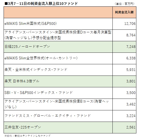 国内公募追加型株式投信(確定拠出年金専用、ファンドラップ専用、及びETF除く)を対象として、ウエルスアドバイザー推計値に基づいて先週(2022年3月7−11日)の純資金流入額上位10ファンドを確認したところ、日経225連動型2ファンドと日本株ブル型1ファンドの計3ファンドが新たにトップ10内にランクインした。 アセットマネジメントOneの「日経225ノーロードオープン」、楽天投信投資顧問の「楽天 日本株4.3倍ブル」の2ファンドが2月21−25日以来2週ぶりにトップ10に返り咲いたほか、三井住友DSアセットマネジメントの「三井住友・225オープン」が2021年以降で見て初めてランクインした。 先週の先進国株式は、ウクライナ情勢の悪化を受けて続落した。国内株式は大幅に4週続落し、日経平均株価は一時1年4カ月ぶりの安値水準に沈んだ。米国株式に投資するファンドなど多くのファンドに対する流入額が先々週(2022年2月28日−3月4日)に比べて減少する中で、日経225連動型ファンドや日本株ブル型ファンドには株価の戻りを見込んだ資金流入が膨らんだ。12位には日興アセットマネジメントの「インデックスファンド225」、14位にはSBIアセットマネジメントの「SBI 日本株4.3ブル」が入った。 先週の純資金流入額トップは「eMAXIS Slim米国株式(S&P500)」。127億円の純資金流入となり、2週連続のトップとなった。このほかには、「eMAXIS Slim全世界株式(オール・カントリー)」、「アライアンス・バーンスタイン・米国成長株投信」の「Dコース毎月決算型(為替ヘッジなし)予想分配金提示型」と「Bコース(為替ヘッジなし)」、「楽天・全米株式インデックス・ファンド」(愛称:楽天・バンガード・ファンド(全米株式))、「SBI・V・S&P500インデックス・ファンド」(愛称:SBI・V・S&P500)、「ファンドスミス・グローバル・エクイティ・ファンド」が先々週に続いてトップ10入りした。 一方、先々週ランクインしていたファンドのうち、「iFreeレバレッジ NASDAQ100」、「キャピタル・インベストメント・カンパニー・オブ・アメリカ ICA」、「SBI・V・全米株式インデックス・ファンド」(愛称:SBI・V・全米株式)がトップ10圏外となった。