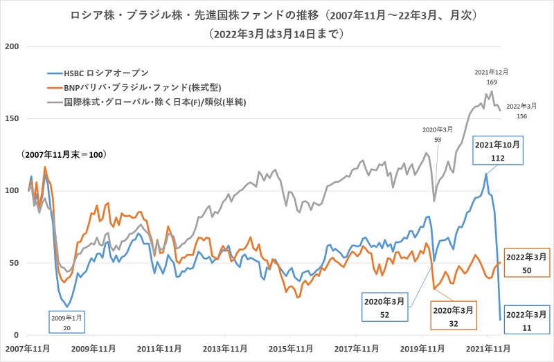 一方、年初から3月14日までの個別ファンドの騰落率で上位にきているブラジル株式ファンドについて、過去の値動きをみると、決して良いパフォーマンスとはいえない。今年に入ってからブラジル株が値上がりしているのは、昨年の年央をピークに年末まで大きく株価が下落した反動という側面が強そうだ。たとえば、「BNPパリバ・ブラジル・ファンド(株式型)」は設定月の2007年11月末を100とすると、22年3月14日は50の水準にとどまる。2008年の「リーマン・ショック」で大幅に値下がりし、その後もずっと低迷してきた。ブラジル株に比較すると、むしろ、ロシア株の方が魅力的な値動きをしているようにもみえる。たとえば、「HSBCロシアオープン」は、「コロナ・ショック」で底値を付けた2020年3月末から、2021年10月末まで約1年半で2.15倍に値上がりしている。この間の先進国株式(除く日本)ファンドの平均上昇率79.63%を大きく上回る上昇になった。