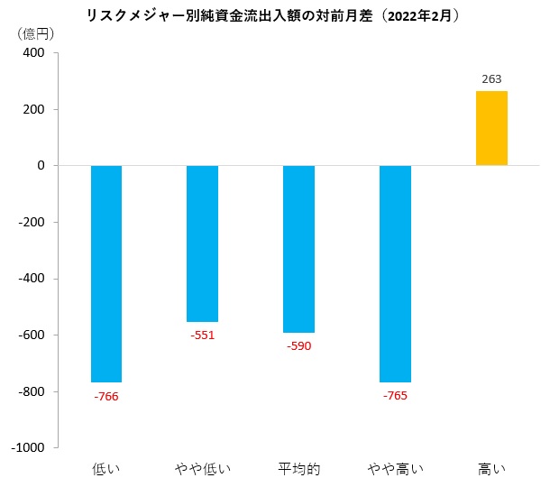 ロシアのウクライナ侵攻を受けて株価急落など金融市場が大揺れとなった2022年2月。リスク回避の動きに国内ファンドへの資金流入は減速したが、その中にあって、相対的なリスクの高いファンドの一部に資金が向かう動きが見られた。 国内公募追加型株式投信(ETF除く)を対象に、ウエルスアドバイザーのリスクメジャー別の純資金流出入額を調べた。リスクメジャーとは、運用期間3年以上の国内公募追加型株式投信について、ファンドのリスク(標準偏差)が全ファンド中でどの水準にあるのかを、「低い」、「やや低い」、「平均的」、「やや高い」、「高い」の5段階で示したものだ。 2022年2月の結果を見ると、「低い」が49億円の純資金流出、「やや低い」が186億円の純資金流入、「平均的」が3384億円の純資金流入、「やや高い」が681億円の純資金流入、「高い」が82億円の純資金流入となった。「低い」はバランス型や債券型ファンドが大半を占めるため、金融市場が混乱した同月には資金流入が見込まれたが、実際には、13カ月ぶりの流出超過となった。一方、リスク回避の動きを背景に資金流出が予想された「高い」は、実に40カ月ぶりの流入超過となった。 2022年2月にファンドに対する資金流入の動きが鈍ったのは確かである。前月との差を見ると、「低い」が766億円の減少となったのを始め、「やや低い」は551億円の減少、「平均的」は590億円の減少、「やや高い」は765億円の減少となった。その中にあって、「高い」のみ263億円の増加となった。 「高い」の中で純資金流入額上位となった3ファンドを見ると、「iFreeレバレッジ NASDAQ100」が74億円の純資金流入、「米国小型バリュー株ファンド Bコース(為替ヘッジなし)」(愛称:アメリカン・エンジェル)が33億円の純資金流入、「トヨタ自動車/トヨタグループ株式ファンド」が27億円の純資金流入となった。いずれも前月から流入超過額が増加した。 「iFreeレバレッジ NASDAQ100」は株式ブル型ファンドで、日々の基準価額の値動きがNASDAQ100指数(米ドルベース)の値動きの2倍程度となることを目指す。「米国小型バリュー株ファンド Bコース(為替ヘッジなし)」は米国の小型バリュー株を主要投資対象とする。「トヨタ自動車/トヨタグループ株式ファンド」は2022年2月末時点のウエルスアドバイザーカテゴリーが「国内大型バリュー」である。日米株価が急落する中で、これらのファンドには、戻りを見込んだ資金やバリュー株の投資妙味を意識した資金が向かったと見られる。