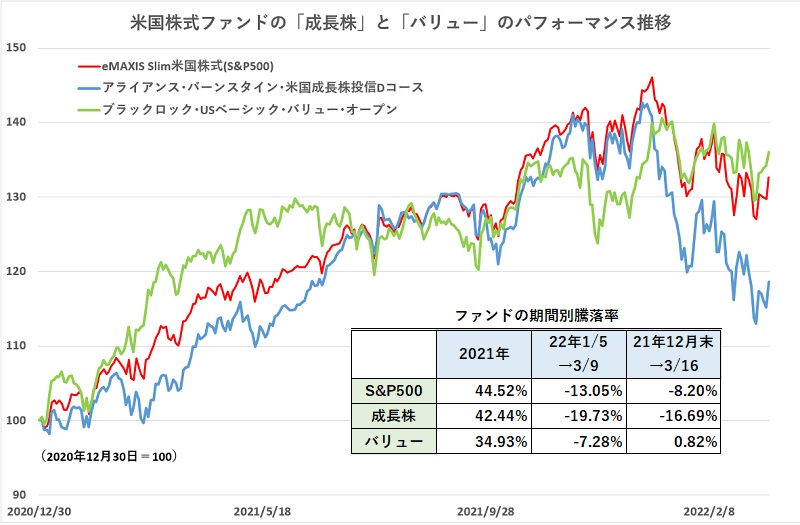米国の政策金利の引き上げが3月16日に決まった。コロナ禍への対応策として打ち出した「ゼロ金利」水準から0.25%引き上げた。また同時に、今後の政策決定会合のたびに、利上げを継続的に実施する見通しも発表された。ウクライナ情勢は依然として緊迫し、停戦交渉の行方も定まっていないが、株式市場は「軍事侵攻」というショックを織り込んで、新しいステージに踏み出そうとしているようにみえる。政策金利決定会合が行われた2日間で、米国の代表的な株価指数「S&P500」は2%超ずつ値上がりし、合計4.43%の上昇になった。米国が金融引き締めに動く今度、米国の株式市場はどのような動きをしていくのだろうか? これからの市場環境に備えて投資するファンドの点検を行いたい。 米国の利上げについては、予想されていたことであり、今後段階的に金利を引き上げていくことも市場は了解済みだった。だからこそ、利上げの発表の後も株価は上昇トレンドを崩すことはなかった。もちろん、16日の株高は、ウクライナとロシアが停戦に向けた協議を続けているという紛争終結への期待感の高まりも背景にはあっただろう。今後、紛争がウクライナの国外に広がるような動きに発展するようなことがなければ、株式市場は戦争終結に向けた取り組みを粛々と見守るということになりそうだ。既に商品先物市場では、一時1バレル=130ドル台に急騰する場面があった原油市場が95ドル台という侵攻前の水準に戻るなど、一足早い落ち着きを見せている。 そこで、戦争の帰趨を横に置いて米国の株式市場を改めて見直してみると、今年1月5日に付けた史上最高値を境にして「グロース株(成長株)」から「バリュー株(割安株)」への主役交代が起こっているようにみえる。「コロナ・バンデミック(世界的まん延)」によって世界の株価が大きく下落した2020年3月から22年1月初頭までの株式市場は、「コロナ・バンデミックが時間の流れを大きく推し進めたデジタルトランスフォーメーション(DX)」に代表される米国のGAFAM(グーグル/アマゾン/フェイスブック(現メタプラットフォームズ)/アップル/マイクロソフト)を頂点としたテクノロジー株が主導する「グロース株相場」だった。 米国を代表する株価指数である「S&P500」は、その指数構成銘柄のトップ10にGAFAMがあり、また、国内公募株式ファンドで最大の純資産残高を誇る「アライアンス・バーンスタイン・米国成長株投信Dコース毎月決算型(為替ヘッジなし)予想分配金提示型」も文字通り「成長株(グロース株)」に投資するファンドとして、大きなリターンをあげた。2021年の年間リターンは、S&P500のインデックスファンドである「eMAXIS Slim米国株式(S&P500)」が44.52%、「アライアンス・バーンスタイン・米国成長株投信Dコース」は42.44%だった。 ところが、今年1月5日にピークを付けてから、インフレ(物価上昇)の高進による米国の利上げ加速懸念、そして、「ウクライナ・ショック」で大きく下落する中では、「アライアンス・バーンスタイン・米国成長株投信Dコース」の下落率が大きくなる。株価のピークからウクライナ・ショックで大きく落ち込んだ3月9日までの下落率は、「S&P500」が13.05%だったが、「アライアンス・バーンスタイン・米国成長株投信Dコース」は19.73%に達した。グロース株式は、それまでの値上がりが大きかっただけに、一部では「買われ過ぎ/割高」との見方もあり、株価上昇の勢いが鈍ると「利益確定」を急ぐ売りが出やすかったことも下落に拍車をかけたと考えられる。 このように大きく落ち込んだグロース株に対し、バリュー株の底堅さが目立つ。たとえば、「ブラックロック・USベーシック・バリュー・オープン」は、株価指標などで割安と判断される銘柄の中で、過小評価状態から回復が見込まれる銘柄に投資するバリュー株ファンドだが、3月16日の段階で、既に昨年末の水準に回復している。昨年末水準に対し、「S&P500」がマイナス8.20%、「アライアンス・バーンスタイン・米国成長株投信Dコース」がマイナス16.69%と依然として大きく沈む中で、「ブラックロック・USベーシック・バリュー・オープン」はプラス0.82%といち早く水面上に顔を出している。 もっとも、今年に入っての下落率が大きいといってグロース株には、今後見込みがないということではない。コロナ禍で始まったリモートワークなどの「新しい働き方」は、世界的な潮流でもあり、コロナのまん延が落ち着いてきたとはいえ、急にストップするわけではないだろう。また、DXだけでなく、「2050年カーボンニュートラル」に向けた脱化石燃料化やCO2排出抑制を実現するための技術開発は待ったなしの状況で、依然として成長企業が生まれてくる余地は大きい。「異常な超低金利・金融緩和状態からの正常化」という大きな環境変化によって、「成長株は何でも上がる」と思われたような市場は確実に変質すると考えられるが、大きく成長する企業の株価が上がるという株式市場のメカニズムが失われる