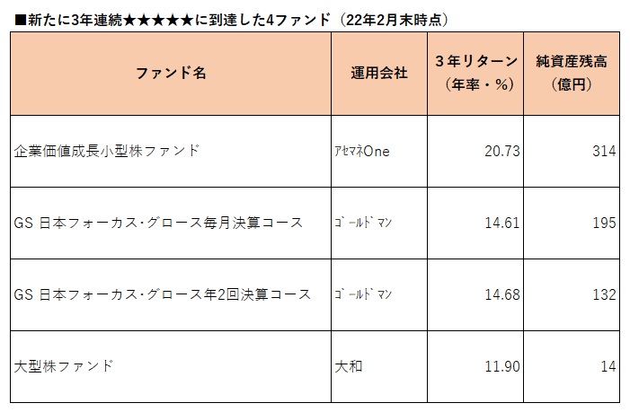 国内アクティブファンド(確定拠出年金専用、ファンドラップ専用、ETF除く)の中で22年2月末時点までの過去3年間(19年3月末〜22年2月末)にかけてファンドレーティングが連続して5ツ星(★★★★★)であったファンドは30本あった。前月末時点から国内株式に投資する3シリーズ4ファンドが新たに加わった。 ウエルスアドバイザーでは、運用期間3年以上のファンドを対象にレーティングを公表している。レーティングは、ファンドのリスク調整後のリターンがその属するカテゴリーの中でどの水準にあるかを5段階で示したもので、最上位の5ツ星は相対的な運用効率に優れていることを示す。 今回新たに3年連続5ツ星に加わったのは、アセットマネジメントOneの「企業価値成長小型株ファンド」(愛称:眼力)、ゴールドマン・サックス・アセット・マネジメント「GS 日本フォーカス・グロース」の「毎月決算コース」と「年2回決算コース」、大和アセットマネジメントの「大型株ファンド」。 「企業価値成長小型株ファンド」は、利益成長の可能性が高いと判断した国内小型株約30〜60銘柄に厳選して投資する。銘柄選定に当たっては、将来のROE(株主資本利益率)の水準や改善の可能性に着目し、経営の健全性や株価の割安度なども考慮する。22年2月末時点のポートフォリオの組入銘柄数は59で、組入上位銘柄は、自動車の電動化などで増加が見込まれるプリント配線板を手掛ける『日本シイエムケイ』(3.2%)、サイバーセキュリティー需要を背景に良好な事業環境を見込む『テクマトリックス』(3.0%)、企業の二酸化炭素排出量削減手段の一つとして廃油リサイクル需要の伸びを見込む『ダイセキ』(2.9%)となっている。同月末時点の過去3年間のトータルリターン(年率)は20.73%とウエルスアドバイザーカテゴリー「国内小型グロース」平均を15.15%上回り、カテゴリー84本中トップとなっている。また、「ファンド オブ ザ イヤー2021」において「国内株式型 部門」の「優秀ファンド賞」を受賞している。 「GS 日本フォーカス・グロース」は、景気変動の影響を受けにくく、持続的な成長が見込まれる国内企業25〜40銘柄程度に厳選して投資する。銘柄選定に当たっては、ブランド力や価格決定力、優秀な経営陣、良好な事業環境などの独自の成長要因を有するか否か、ROEの高水準での推移もしくは上昇が見込まれるかなどに着眼する。マザーファンドの22年2月末時点の組入銘柄数は34で、組入上位銘柄は『ソニーグループ』(6.5%)、『信越化学工業』(6.0%)、『HOYA』(5.9%)。同月末時点で残高の大きな「毎月決算コース」の過去3年間のトータルリターンは14.61%とカテゴリー「国内大型グロース」平均を4.66%上回り、カテゴリー内上位8%(208本中16位)となっている。 「大型株ファンド」は、国内の資本金100億円以上の大型株を主要投資対象とし、長期的な視点から好利回り株を中心に投資する。22年2月末時点の組入銘柄数は38で、組入上位銘柄は、『トヨタ自動車』(5.2%)、『日本電信電話』(4.8%)、『ソニーグループ』(4.4%)。同月末時点の過去3年間のトータルリターンは11.90%とカテゴリー「国内大型ブレンド」平均を4.11%上回り、カテゴリー内上位8%(294本中22位)となっている。