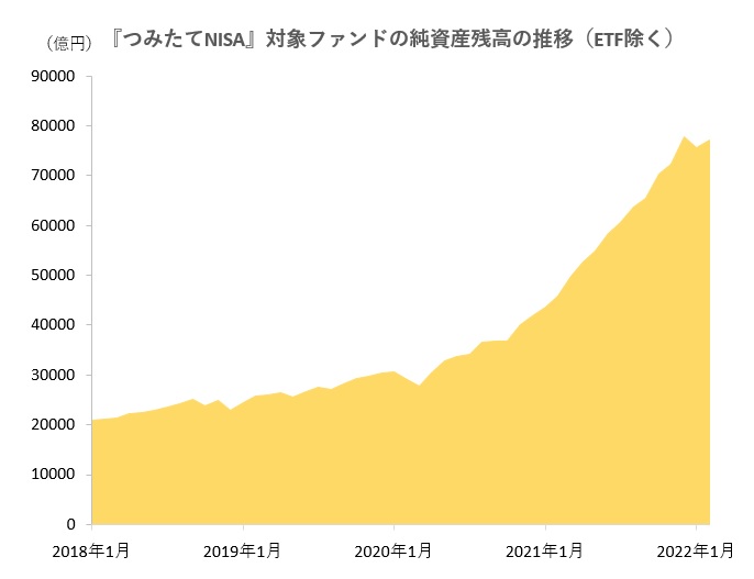 金融庁は先日、フィデリティ投信のターゲットイヤー型ファンドシリーズ「フィデリティ・ターゲット・デート・ファンド(ベーシック)」(愛称:将来設計(ベーシック))の「2065」と「2070」を、つみたてNISAの対象ファンドに追加した。つみたてNISA対象ファンドは、指定インデックス投資信託181本、指定インデックス投資信託以外の投資信託(アクティブ運用投資信託等)22本、ETF7本の計210本となる。 「フィデリティ・ターゲット・デート・ファンド(ベーシック)」は目標年(ターゲットイヤー)に向けて資産配分を変更(リスク資産のウエイトを逓減)するターゲットイヤー型ファンド。国内外のインデックスファンドへの投資を通じて、国内・先進国・新興国株式、世界債券、国内短期債券、短期金融商品等に投資する。ターゲットイヤーの異なる9ファンドからなり、既につみたてNISA対象ファンドに採用されている「2040」、「2045」、「2050」、「2055」、「2060」に続いて、今回「2065」、「2070」が採用された。「2065」、「2070」ともに2022年2月28日に運用を開始したばかりで、目論見書によると、当初の資産配分は両ファンドともに「国内株式15%、先進国海外株式70%、新興国株式15%」としている。 つみたてNISA対象ファンドは2018年1月の制度開始後数度にわたって追加されてきた。便宜的に現時点(2022年3月30日時点)の対象ファンド(ETF除く203本)について、同年2月の純資金流出入額を見ると、2301億円の純資金流入と15カ月連続の流入超過となった(※)。同月末時点の純資産残高の合計は7兆7195億円。米金融政策の引き締め前倒し観測から日米欧で株安となった同年1月は一時的に落ち込んだものの、2020年後半からの増加基調は継続している。 (※集計に当たっては、つみたてNISA口座以外の一般口座を通じた資金フローも含まれている点をお断りしたい)