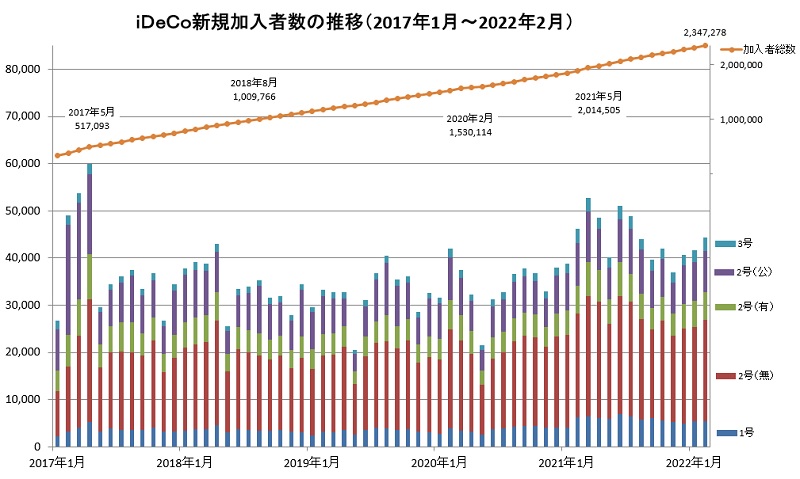 国民年金基金連合会が4月1日に発表したiDeCo(イデコ、個人型確定拠出年金)の業務状況によると、2月の新規加入者数は4万4258人で加入者総数は234万7278人になった。新規加入者数は4万人の大台は確保したものの、21年2月の新規加入者は4.6万人を超えており、前年同月との比較では2020年8月以来、18カ月ぶりにマイナス成長になった。この2年間ほど加入者増に拍車がかかっていたが、中でも21年2月〜4月に新規加入者増の山が来ている。21年3月は約5.3万人という大きな加入者を獲得した月にあたり、来月は、この記録にどこまで迫れるのか注目したい。なお、従業員のiDeCoに企業が上乗せ拠出をするiDeCo+(中小事業主掛金納付制度)は、実施事業所数は4083事業所、対象従業員数は2万5731人になった。 2月の新規加入者の内訳は、第1号加入者は5469人(前月5458人)、第2号加入者は3万5999人(前月3万3670人)、第3号加入者は2790人(前月2517人)となり、全ての年金保険種別で前月を上回る加入者になった。なお、第2号加入者の中では、企業年金なしの新規加入者が2万1454人(前月1万9925人)。共済組合員(公務員)の新規加入者は8738人(前月8239人)となった。 2月の新規加入者数は全体では前年同月比4.2%減になった。前年同月比ではマイナスになったものの、一昨年2020年2月は4.2万人弱の新規加入者であり、一昨年と比較すると5.5%増の水準になる。iDeCoへの加入意欲は衰えたところはないと考えられる。 ただ、今年に入ってから、米国の利上げに向けた動きが顕在化し、加えて、2月下旬にはロシアによるウクライナ侵攻が勃発。加えて、コロナ禍については中国が中心都市上海でロックダウン(都市封鎖)を実施するなど、依然として感染拡大への備えが必要な状態が続いていることなど、経済の先行きを不透明にする要素が噴出し、米国株式をはじめ世界の株式市場が不安定な状況に陥っている。昨年末までは、米国の株価が史上最高値を更新し続けるほど、極めて好調な状態にあったため、株式に投資していれば資産が増えるということが実感できる環境だった。その追い風が逆風になりかねない環境になっており、それがiDeCoの新規加入者数にどのような影響を与えるのかに注目される。 iDeCoは60歳になるまで換金ができない、超長期の資産運用手段であるため、足元の株式投資環境の悪化は、新規加入のネックにはならないはずだ。むしろ、株価等が下落する局面では、積立てで購入していくことを考えれば、より安い価格で株式等を購入できるチャンスともいえ、将来の資産形成にはプラスの影響すら考えられる。長期・積立投資の効用について理解があれば、足元の不安定な市場環境に影響されることなく、新規加入の勢いは続くはずだ。非常に好調な新規加入者の状況が続いていた中で起こった市場の変調だけに、ここからの新規加入者の状況は、日本に資産運用のリテラシーが浸透したかどうかを量る試金石にもなりそうだ。(グラフは、iDeCoの新規加入者数の推移)