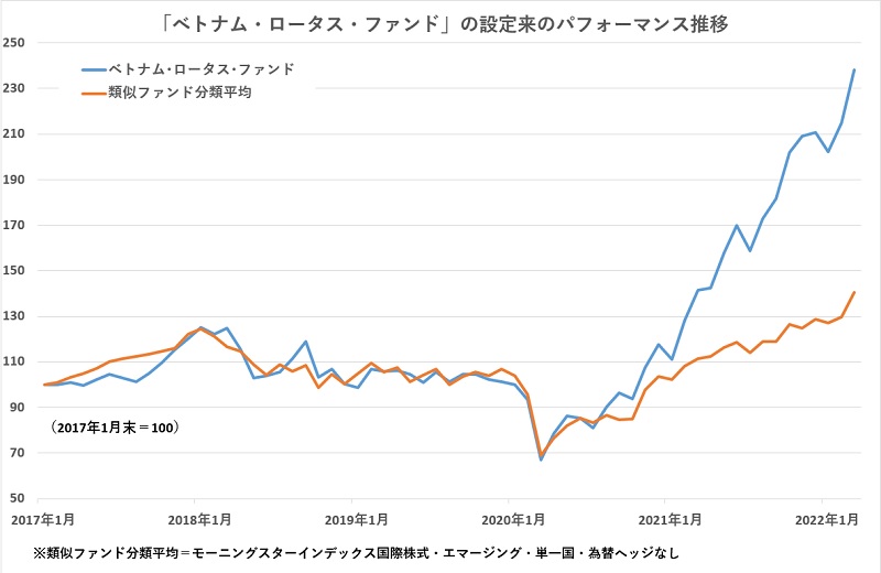 朝倉 「ロータス」は、昨年1年間のパフォーマンスが素晴らしかったのですが、2017年1月の設定以来5年間でも素晴らしいパフォーマンスを上げているファンドです。今後も投資家の皆さんの期待に応えるよう頑張っていただきたいと思います。(グラフは、「ベトナム・ロータス・ファンド」の設定来のパフォーマンス推移)
