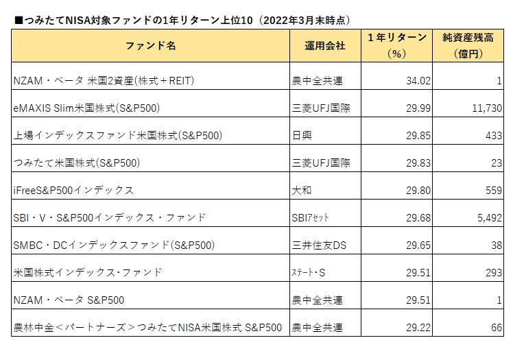 つみたてNISA対象211ファンドの2022年3月末時点における過去1年間のトータルリターンを見ると、農林中金全共連アセットマネジメントの「NZAM・ベータ 米国2資産(株式+REIT)」がリターン34.02%でトップとなった。同ファンドは、S&P500指数、S&P米国REIT指数をベンチマークとするマザーファンドに均等に投資するインデックスファンドである。 第2位の「eMAXIS Slim米国株式(S&P500)」から第10位の「農林中金<パートナーズ>つみたてNISA米国株式 S&P500」までをS&P500をベンチマークとするインデックスファンド及びETFが占めた。2022年3月までの1年間にS&P500が14.03%上昇(TOPIXは0.39%下落)する中、上位をS&P500連動型ファンドが席捲したが、トップの「NZAM・ベータ 米国2資産(株式+REIT)」はS&P500だけではなく、米国REITの大幅な上昇も追い風となった。 なお、金融庁は先日、つみたてNISA対象ファンドに、HSBCアセットマネジメントの「HSBC ワールド・セレクション(成長コース)」(愛称:ゆめラップ成長)を追加した。対象ファンドは、「指定インデックス投資信託」181本、「指定インデックス投資信託以外の投資信託(アクティブ運用投資信託等)」23本、上場株式投資信託(ETF)7本の計211本となる。 「HSBC ワールド・セレクション(成長コース)」は、バランス型の「HSBC ワールド・セレクション」シリーズ4本のうちの1本。同シリーズは、ファンドへの投資を通じて、「先進国株式」、「新興国株式」、「先進国債券」、「新興国債券」、及びその他資産(ハイ・イールド債券、不動産株・REITなど)に分散投資する。 リスク水準の異なる「安定コース」、「安定成長コース」、「成長コース」3コースのほか、利回りも考慮した「インカムコース」がある。目標とするリスク(標準偏差)の水準は「安定コース」が年率5%程度、「安定成長コース」は年率5〜8%程度。今回つみたてNISA対象ファンドとなった「成長コース」は年率8〜11%程度、「インカムコース」も年率8〜11%程度となっている。「成長コース」の2022年2月末時点のポートフォリオを見ると、世界株式(米国、欧州、日本など)49.0%、新興国株式(新興国、中国)6.7%、世界国債13.2%、新興国債券4.3%、ハイ・イールド債券6.3%、不動産・その他13.4%などとなっている。