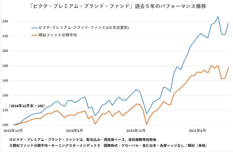 ピクテ投信投資顧問が設定・運用する「ピクテ・プレミアム・ブランド・ファンド(3カ月決算型)」は、2021年のトータルリターンは37.83%と、類似ファンド分類平均14.16%上回った。また、2021年12月末時点における過去5年間のトータルリターン及びシャープレシオは、それぞれ類似ファンド分類内で上位10%以内と、長期の運用成績及び運用の効率性は相対的な優位性を示している。ファンド オブ ザ イヤー2021「国際株式(グローバル・含む日本)型」部門で優秀ファンド賞を受賞した。同ファンドが着目する「プレミアム・ブランド企業」がなぜ、中長期的に比較優位な成長が可能なのか、同社投資戦略部ストラテジストの田中純平氏に聞いた。 ――ファンドの特徴は? 主に世界のプレミアム・ブランド企業の株式に投資をするファンドです。プレミアム・ブランド企業とは、流行を創造するデザインや、最高品質などに基づくブランド力により消費者に幸福感、優越感などの感情をもたらすことができる商品・サービスを提供している企業を指します。 プレミアム・ブランドは、選ばれた企業のみが持っている「ブランド力」があり、一般的にプレミアム・ブランドの商品・サービスは高価格でも消費者に受け入れられる特徴があります。当ファンドはこのような企業に投資をすることで、信託財産の成長を目指すファンドです。 ――不安な相場が続く中でも良好なパフォーマンスを維持できた背景は? 2021年は世界的にインフレ圧力が高まった局面でした。そのような中で投資家から注目された一つの指標が、企業の価格決定力だと思います。価格決定力とは、言い換えれば「値上げ力」になります。 人件費や原材料費が値上がりする中、コスト増加分を販売価格やサービス価格に十分転嫁し、収益性を維持できるかどうかが、企業の利益成長性を見極める上で重要になったと考えられます。 当ファンドは高いブランド力を有するプレミアム・ブランド企業の株式に投資を行っておりますので、高い収益性や利益成長性といったプレミアム・ブランド企業の特徴が株価を牽引する一つの材料になったと考えられます。 ――当ファンドの最大の強みは? プレミアム・ブランド価値は、容易に形成できるものではないため、新規参入が難しい分野となっております。このため、プレミアム・ブランド企業は価格競争に巻き込まれることが少なく、高価格・高収益を実現する企業が多くみられます。 一般的な企業の場合、競合他社が参入してくると、値下げ競争が発生することがございます。特に先進国企業の場合、人件費などが割安な新興国企業による値下げ競争に巻き込まれる傾向があります。しかし、当ファンドが注目するプレミアム・ブランド企業は、高いブランド力に裏付けされた熱狂的なファンやリピーターといった顧客層を有しておりますので、参入障壁が相対的に高い事業を展開できるということが強みとなっています。 ――今後の見通しは? 新型コロナウイルスの感染拡大によって、私たちの経済・社会活動は大きく制約を受けることになりましたが、ワクチン接種の拡大や治療薬の開発・承認によって世界経済は再び正常化に進むことが期待されます。 その中で注目されるのが、「リベンジ消費」です。「リベンジ消費」とは、これまで我慢していた消費・行動意欲を爆発させるように、コロナ禍以前よりも多くの消費や行動をする現象を指しております。 そういった状況になれば、人々の注目は再びプレミアム感がある高級品に向かうことが想定されますので、新型コロナウイルスの感染収束による恩恵を当ファンドは享受することが期待されます。 ――最後に投資家の方々へのメッセージは? 当ファンドでは、価格決定力や参入障壁の高さ、リベンジ消費という観点だけでなく、アジア新興国の購買力増加や、女性の社会進出、そして、富裕層の所得拡大といった中長期的な成長の牽引役にも注目しております。 マーケットでは変動率の高い環境が続いておりますが、ぜひ、中長期的な観点で当ファンドにご注目いただきますと幸いです。(グラフは、「ピクテ・プレミアム・ブランド・ファンド」過去5年のパフォーマンス推移)