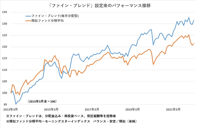 日興アセットマネジメントが設定・運用する「ファイン・ブレンド(毎月分配型)」は、2021年のトータルリターンは5.68%と、類似ファンド分類(バランス・安定)平均を1.85%上回り、月次のトータルリターンは12カ月中11カ月で±2%以内にとどまった。また、2021年12月末までの過去5年間のトータルリターン(年率)は2.78%となり、類似ファンド分類平均を0.53%上回るなど、中長期的に安定的に比較優位な運用成績になっている。ファンド オブ ザ イヤー2021「バランス型」部門で優秀ファンド賞を受賞した。同社資産運用推進部 推進企画1グループのシニアアドバイザー佐々木裕子氏に、同ファンドの運用の仕組みと魅力について聞いた。 ――ファンドの特徴は? 当ファンドは、収益が期待できる五つの資産に分散投資を行います。その上で、年金運用などでも用いられる価格変動に着目した資産配分戦略を用いることで、大きな下落を抑制し、安定的な資産成長を目指すバランスファンドです。 このような運用を地道に行った結果、2013年3月の設定以降も安定的で良好なパフォーマンスを実現してきました。 ――変動の大きな相場でも安定した収益が得られた理由は? 理由としては、値動きと収益性に着目し、異なる強みを持つ五つの資産に投資をするという点が挙げられます。 当ファンドは、安定性の「日本国債」、利回り期待の「海外債券」、値上がり期待の「グローバル株式」、利回りと値上がり期待の「グローバルREIT」、そして、他資産と相関が低くインフレ時やリスク回避局面で強みを持つ「金」というこだわりの五つの資産に分散投資しています。 しかし、資産分散によって変動を抑制するだけでは、リスクをとって運用する意味がありません。当ファンドでは、先ほどご紹介したように、投資する各資産の利回りなどにも着目し、収益がより期待できる資産を選んでいます。 例えば、「日本国債」では、相対的に高い利回りが期待できるものの、個人投資家が直接保有することができない超長期国債を中心に投資をしています。 組入資産の値動きと収益性にこだわり、分散投資を地道に続けた結果、2022年2月末時点で、毎月分配型の設定以来の騰落率はプラス30.2%、そして、月間の騰落率が2%超のマイナスとなったのはわずかに5回と比較的、安定的で良好なパフォーマンスとなりました。 ――他のバランス型投信とは異なる独自、かつ、特徴的な運用戦略は? 当ファンドは、各資産の価格変動リスクに着目し、配分比率を決めるファイン・ブレンド戦略を用いています。具体的には、投資している五つの資産の価格変動、すなわち、リスクに着目し、ファンドの基準価格に与える各資産の影響度合いが概ね均等になることを目指して資産配分を決めます。この戦略は「リスクパリティ戦略」とも呼ばれ、年金運用でも着目している運用手法です。 資産配分は、市場変動などによって決まります。市場変動の大きい局面では、債券など安定的な資産が多めに、市場変動の小さい局面では、株式など収益性の高い資産が多めの比率となります。 また、投資環境に応じて変化するリスク度合いに合わせ、資産配分は定期的に見直します。さらに、市況を予測するなどの判断はせず、ルールベースで資産配分を決定します。市場急変時にはキャッシュなどに退避することなく、常に投資をし続ける点もポイントです。 配分の着眼点をリスクに置くことで、投資タイミングや大きな価格変動の影響を受けにくいことが、当ファンドの強みと言えます。 ――資産を中長期で運用していくにあたり、運用戦略上のポイントは? 当ファンドは、市場変動に左右されにくい安定した運用を行うことを目指しています。資産形成において大切なことは、大きく負けないことだと考えています。資産が値下がりすると、その回復には、下落時よりも大きな上昇の力が必要となり、取り戻すことが大変だということがわかります。 当ファンドの税引き前、分配金再投資ベースの基準価格の月次騰落率を見ると、設定以来、おおむね2%以内に収まっており、価格変動を抑えながら、安定的な成長を実現してきたことがわかります。大きく負けないこと、これは資産運用では重要なポイントになると考えます。過去の実績からも、当ファンドの運用戦略は中長期の資産形成に適しているものと考えます。 ――最後に投資家の方々へのメッセージは? 資産形成で大切なことは、今後の予測や投資タイミングの見極めではなく、市場環境に左右されずに安定的な成長を目指し、市場に居続けることだと考えます。 値動きと収益性に着目した値動きの異なる五つの資産を、ファイン・ブレンド戦略を通じて資産配分し、基準価格の変動幅を抑えることで、安定的な成長を目指すことができる、それが当ファンドです。まさに当ファンドは、資産運用の土台に適したバランスファンドだと考えます。皆様の資産形成のコア商品としてぜひご検討ください。(グラフは、「ファイン