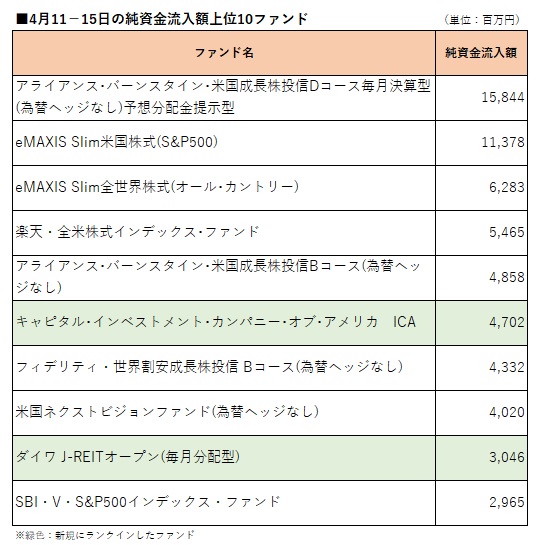 国内公募追加型株式投信(確定拠出年金専用、ファンドラップ専用、及びETF除く)を対象として、ウエルスアドバイザー推計値に基づいて先週(2022年4月11−15日)の純資金流入額上位10ファンドを確認したところ、「アライアンス・バーンスタイン・米国成長株投信Dコース毎月決算型(為替ヘッジなし)予想分配金提示型」(=AB・米国成長株投信Dコース)が2週ぶりのトップとなった。 同ファンドの今年に入ってからのトップ獲得は、15週のうち10週目となる。残りの5週は「eMAXIS Slim米国株式(S&P500)」が獲得しており、今年は両ファンドによるトップ独占が続いている。なお、長期金利上昇よるハイテク株売りを受けて、先週の米国株式市場でNYダウなど主要3指数が続落する中、先週の対象ファンド全体の純資金流入額は475億円と、先々週(2022年4月4−8日)比41.3%減少した。 「アライアンス・バーンスタイン・米国成長株投信Dコース毎月決算型(為替ヘッジなし)予想分配金提示型」は158億円の純資金流入となり、3月28日−4月1日以来のトップとなった。同シリーズの「Bコース(為替ヘッジなし)」のほか、「eMAXIS Slim米国株式(S&P500)」、「eMAXIS Slim全世界株式(オール・カントリー)」、「楽天・全米株式インデックス・ファンド」(愛称:楽天・バンガード・ファンド(全米株式))、「フィデリティ・世界割安成長株投信 Bコース(為替ヘッジなし)」(愛称:テンバガー・ハンター)、「米国ネクストビジョンファンド(為替ヘッジなし)」、「SBI・V・S&P500インデックス・ファンド」(愛称:SBI・V・S&P500)が先々週に続いてトップ10入りした。 先週は2ファンドがトップ10内に返り咲いた。「キャピタル・インベストメント・カンパニー・オブ・アメリカ ICA」、「ダイワ J−REITオープン(毎月分配型)」がともに3月28日−4月1日以来2週ぶりにランクインした。 一方、先々週ランクインしていたファンドのうち、「日経225ノーロードオープン」、「マニュライフ・円ハイブリッド債券インカム・ファンド(年1回決算型)」がトップ10圏外となった。
