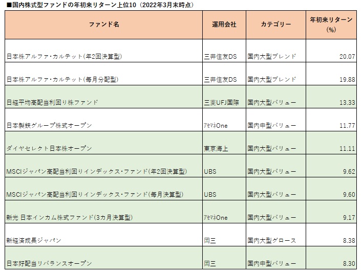 国内ファンドの2022年3月末までの年初来リターンを調べたところ、国内株式に投資するファンドの上位には、配当利回りに妙味のある銘柄に投資するファンドが並んだ。国内株式が年初から低調に推移する中で、高配当利回り関連ファンドを中心にバリュー株のパフォーマンスが良好となった。 国内株式に投資するファンド(確定拠出年金専用、ファンドラップ専用、ETF除く、通貨選択型も除く)のリターン上位10ファンドを見ると、7ファンドをウエルスアドバイザーのカテゴリー分類で割安株への投資を示す「バリュー」に分類されるファンドが占めた。このうち6ファンドは、配当利回りに着目して銘柄を選択するファンドとなった。 2022年の国内株式は、米金利上昇、ロシアのウクライナ侵攻、原油価格の上昇、インフレ進行などが響いて年初から下落し、日経平均株価の年初来下落率は3月9日には14.15%に達した。その後やや戻したものの昨年末の水準を回復できないでいる(4月19日時点の年初来下落率は6.27%)。国内株式型ファンドについては、低調な株価の推移を受けて成長株であるグロース株に投資するファンドのパフォーマンスが概ね低調な一方、バリュー株ファンドを見直す動きが広がり、安定的なインカム収益が見込める高配当利回り関連ファンドがリターン上位に浮上した。 配当利回りに着目する6ファンド(図表で緑色マーカーを付したファンド)のうちリターン13.33%でトップとなった「日経平均高配当利回り株ファンド」は、日経平均株価採用銘柄のうち予想配当利回り上位30銘柄に投資(組入比率は流動性を考慮して決定)する。2022年3月末時点のポートフォリオの予想配当利回りは5.7%と日経平均株価の1.9%を大幅に上回る。組入上位銘柄は予想配当利回り11.2%の『日本郵船』、同10.2%の『商船三井』、同3.7%の『三菱UFJフィナンシャル・グループ』となっている。 国内株式型ファンドでリターントップとなった「日本株アルファ・カルテット(年2回決算型)」は、国内株式への投資に加えて、「高金利通貨戦略」、「株式カバードコール戦略」、「通貨カバードコール戦略」を組み合わせることで、インカムゲインとオプションプレミアムを確保しながら、中長期的な収益の獲得を図る。 なお、先進国株式ファンドのリターン上位には、「世界シェールガス株ファンド」(リターンは40.19%)、「シェール関連株オープン」(同38.65%)、「GS MLPインフラ関連証券ファンド 年2回決算コース(愛称:ザ・シェール)」(同36.90%)など、実質的に米国のエネルギー関連企業に投資するファンドが並んだ。ロシアのウクライナ侵攻を受けて、原油価格、天然ガス価格が高水準で推移していることが寄与した。欧州がロシアからのエネルギー依存脱却を図る中で、米国産の原油や天然ガスの需要が拡大するとの観測もあり、今後も注目される。