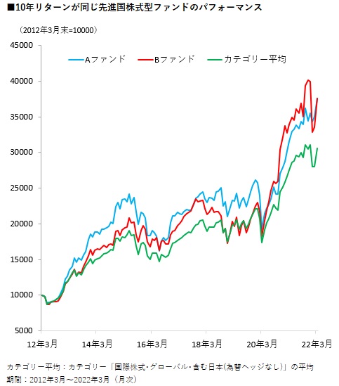 アクティブファンドの選定・保有に際してはリターンに目が向かいがちであるが、リスク(標準偏差、リターンのブレ)もしっかりと見ておきたい。アクティブファンドは、独自の視点からの銘柄選択によって市場平均を上回るリターンを目指すため、リスクが大きくなることもある。高リスクであってもそれに見合ったリターンを獲得できれば良いとの見方もあるが、ハイリスクは必ずしもハイリターンを保証しない。米長期金利の上昇、米金融引締めへの警戒感、中国の景気減速懸念などを背景に世界の金融市場が揺れている今は、リスクを再認識する良い機会である。 日本を除く先進国株式に投資するウエルスアドバイザーカテゴリー「国際株式・グローバル・含む日本(為替ヘッジなし)」に属するファンド(確定拠出年金専用、ファンドラップ専用、ETF除く、通貨選択型も除く)の中から、2022年3月末時点の過去10年間のトータルリターンがほぼ同じ2本のファンドを選び出し、直近10年間のパフォーマンスの推移を調べた。結果的に10年間のリターンが同じであっても、各々がどのような推移を辿ったのか確認するのが目的である。 対象としたのはともに10年リターン(年率)が14.15%のAファンドとBファンド。10年間のリスク(年率)は、Aファンドが17.82%、Bファンドが19.90%と約2ポイントの差がある。 10年前の2012年3月末時点を10000として指数化すると、Bファンドに比べてリスクの小さなAファンドは一貫してカテゴリー平均を上回った。コロナショック時の2020年3月の頃にはほぼカテゴリー平均並みとなったものの、それ以外はカテゴリー平均を常に一定幅上回って安定的に推移した。一方、Bファンドは、2018年後半から2019年半ばにかけて度々カテゴリー平均を下回った。他のファンドとパフォーマンスを見比べて継続保有を断念する投資家もあっただろう。コロナショック後には大幅に上昇したものの、2021年末からは乱高下気味となっている。直近10年間の世界的な株高基調を背景に両ファンドともに概ね右肩上がりのパフォーマンスとなったが、途中経過には違いが見られる。 両ファンドは、結果的に直近10年間は同じリターンとなったが、10年後のリターンが同じになる保証はない。ただ、Aファンドについては、今後も、カテゴリー平均を安定的に上回るリターンの獲得期待が高まる。一方、Bファンドについては、カテゴリー平均を大幅に上回ることも、再び下回ることも想定され、カテゴリー平均を大幅に劣後し回復までに時間を要することも想定される。 高リスクであろうとも、運用哲学・プロセスを評価し許容し、高パフォーマンスを期待するというのもアクティブ投資の一側面ではある。とはいえ、高リスクファンドには大幅下落に見舞われる可能性もある。アクティブファンドの選択においては、運用哲学・プロセスの吟味は勿論だが、パフォーマンス押し下げ要因となるコスト水準や、安定的な運用の可能性に繋がるリスク水準についても考慮したい。