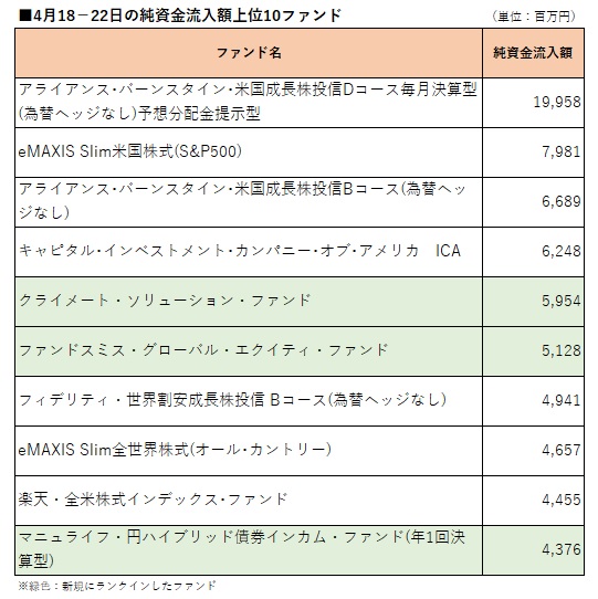 国内公募追加型株式投信(確定拠出年金専用、ファンドラップ専用、及びETF除く)を対象として、ウエルスアドバイザー推計値に基づいて先週(2022年4月18−22日)の純資金流入額上位10ファンドを確認したところ、22日設定の「クライメート・ソリューション・ファンド」が新規にランクインしたほか、2ファンドが返り咲いた。 三井住友DSアセットマネジメントの「クライメート・ソリューション・ファンド」は、外国籍ファンドへの投資を通じて、実質的に日本を含む世界の企業の中から、気候変動問題解決への貢献が見込まれる企業の株式に投資する。現時点では、「電力供給」、「建物」、「食糧・水」、「リサイクル」、「移動」の5つのテーマに着目し、関連企業に投資する。外国籍ファンドの運用は、JPモルガン・アセット・マネジメント(UK)リミテッドが担う。ポートフォリオは、世界の企業の株式を、AI(人工知能)によりテーマに関連する約300銘柄に絞り込んだ後、JPモルガンのグローバルなリサーチ力を活用して、約50〜100銘柄で構築する。 先週純資金流入額トップとなったのは、「アライアンス・バーンスタイン・米国成長株投信Dコース毎月決算型(為替ヘッジなし)予想分配金提示型」。約200億円の純資金流入となり、先々週(2022年4月11−15日)に続く2週連続のトップとなった。同シリーズの「Bコース(為替ヘッジなし)」のほか、「eMAXIS Slim米国株式(S&P500)」、「キャピタル・インベストメント・カンパニー・オブ・アメリカ ICA」、「フィデリティ・世界割安成長株投信 Bコース(為替ヘッジなし)」(愛称:テンバガー・ハンター)、「eMAXIS Slim全世界株式(オール・カントリー)」、「楽天・全米株式インデックス・ファンド」(愛称:楽天・バンガード・ファンド(全米株式))が先々週に続いてトップ10入りした。 先週は2ファンドがトップ10内に返り咲いた。「ファンドスミス・グローバル・エクイティ・ファンド」は3月28日−4月1日以来3週ぶり、「マニュライフ・円ハイブリッド債券インカム・ファンド(年1回決算型)」は4月4日−4月8日以来2週ぶりのランクインとなった。 一方、先々週ランクインしていたファンドのうち、「米国ネクストビジョンファンド(為替ヘッジなし)」、「ダイワ J−REITオープン(毎月分配型)」、「SBI・V・S&P500インデックス・ファンド」(愛称:SBI・V・S&P500)がトップ10圏外となった。