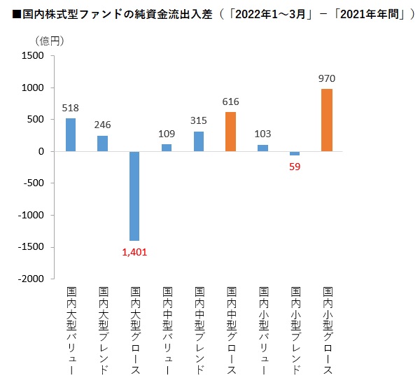 国内ファンドへの純資金流出入の推移を見ると、ここ数年、国際株式型ファンドへの高水準な流入が続いている。バランス型ファンドへの流入も高い水準で安定している。その中にあって、2022年に入ってからの回復ぶりが際立つのが国内株式型ファンド。中小型の成長株(グロース株)に投資する一部のファンドがけん引役となっている。 国内ファンド(確定拠出年金専用、ファンドラップ専用、ETF除く)の2022年1−3月の純資金流出入額の合計をウエルスアドバイザーの大分類別に見ると、「国際株式型」が1兆3368億円の流入超過となり、流入超過額は10分類中トップとなった。国際株式型は、2020年(年間、以下同)、2021年(年間、以下同)と2年連続でトップであり、ここ数年の米国株高を背景にした旺盛な資金流入が続いている。「バランス型」は2022年1−3月に1379億円の流入超過となり、2020年、2021年に続く第3位と上位を維持した。 2022年1−3月の純資金流入額で第2位となったのは「国内株式型」で、流入超過額は2342億円となった。2018年年間の第2位から、2019年年間、2020年と2年連続の最下位(2020年は1兆3185億円の流出超過)に沈んだが、2021年は第6位(925億円の流入超過)と順位を上げ、今回上位に浮上してきた。 国内株式型の資金フローをカテゴリー別に見ると、成長株に投資する「グロース」が存在感を放ち、中でも、中小型グロースの回復ぶりが目立つ。「国内大型グロース」は2022年1−3月に1627億円の流入超過となり、国内株式に投資する9カテゴリー(大型、中型、小型の規模と、バリュー、ブレンド、グロースというスタイルの組み合わせ)の中で流入超過額がトップとなった。ただし、日経225連動型のインデックスファンドへの資金流入が中心で、また、2021年との比較では、流入超過額は1401億円減少した。 一方、「国内中型グロース」は2022年1−3月に224億円の流入超過(2021年は392億円の流出超過)、「国内小型グロース」は同232億円の流入超過(同738億円の流出超過)となり、2022年1−3月の2021年との比較では、616億円、970億円改善した。 割安株に投資する「バリュー」について見ると、「国内大型バリュー」は2022年1−3月に45億円の流入超過に転換し、2021年との比較では518億円と大幅な改善が見られたが、「国内中型バリュー」は2022年1−3月に36億円の流入超過に転換したものの、2021年からの改善幅は109億円に留まり、「国内小型バリュー」は2022年1−3月に6億円の流出超過(2021年との比較では103億円の改善)となった。 2022年1−3月のリターンを見ると、「国内大型バリュー」5.08%、「国内中型バリュー」3.11%(『国内小型バリュー』は▲1.88%)に対し、「国内大型グロース」▲4.37%、「国内中型グロース」▲7.65%、「国内小型グロース」▲10.30%と「バリュー優位・グロース劣後」となった。 パフォーマンス面で劣後する中で、「国内中型グロース」への資金流入をけん引したのは、レオス・キャピタルワークスの「ひふみプラス」。2022年1−3月は193億円の流入超過(2021年は110億円の流入超過)となった。マザーファンドが同一の「ひふみ投信」の流入超過額23億円と合わせた流入超過額は215億円となる。 「国内小型グロース」では、1月に設定された日興アセットマネジメントの「ジパング・オーナー企業株式ファンド」が2022年1−3月に133億円の流入超過となった。また、アセットマネジメントOneの「MHAM 新興成長株オープン」(愛称:J−フロンティア)と「企業価値成長小型株ファンド」(愛称:眼力)も2021年の流出超過から2022年1−3月は流入超過に転じている。 2022年に入ってから、金利上昇を受けて米国でグロース株への売り圧力が度々強まるなど、グロース株に対する見方が厳しくなっている。その中にあって、国内中小型のグロース株ファンドの一角には、成長を期待した資金が流入している。