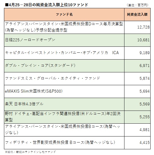 国内公募追加型株式投信(確定拠出年金専用、ファンドラップ専用、及びETF除く)を対象として、ウエルスアドバイザー推計値に基づいて先週(2022年4月25−28日)の純資金流入額上位10ファンドを確認したところ、26日設定の「ダブル・ブレイン・コア(スタンダード)」が新規にランクインした。既存ファンドでは、2ファンドが返り咲き、1ファンドが2021年以降で初めてランクインした。 野村アセットマネジメントの「ダブル・ブレイン・コア(スタンダード)」は、26日に設定された「ダブル・ブレイン・コア」3ファンドのうちの一つ。英マン・グループが運用する外国籍ファンドへの投資を通じて、新興国を含む世界各国の株式、債券、商品等に関連する流動性の高いデリバティブ取引、為替予約取引等を実質的な主要取引対象とし、債券等を実質的な主要投資対象とする。 ポートフォリオは、「トレンド戦略」と「リスクコントロール戦略」から構成され、各戦略のリスク水準を踏まえて配分比率が決定される。「トレンド戦略」では、各投資対象を売り持ち(ショート)または買い持ち(ロング)して、市場の上昇トレンド・下降トレンドの双方に追随し、絶対収益の獲得を目標に積極的な運用を行う。「リスクコントロール戦略」では、各投資対象を買い持ち(ロング)して、安定した収益の獲得を目標に運用を行う。 『スタンダード』のほか、リスク水準の違いによって『マイルド』、『ブル』のコースがある。各戦略の投資配分比率の合計が、『スタンダード』は原則としてファンドの純資産総額と同程度、『マイルド』は概ね半分、『ブル』は原則として2倍程度となるように調整を行う。『マイルド』の先週の資金フローは3億円の純資金流入、『ブル』は23億円の純資金流入となった。 既存ファンドでは、「日経225ノーロードオープン」、「楽天 日本株4.3倍ブル」、「野村 ドイチェ・高配当インフラ関連株投信(米ドルコース)年2回決算型」が新規にランクインした。「日経225ノーロードオープン」は4月4−8日以来3週ぶり、「楽天 日本株4.3倍ブル」は3月7−11日以来7週ぶりにトップ10内に返り咲いた。「野村 ドイチェ・高配当インフラ関連株投信(米ドルコース)年2回決算型」は2021年以降で初めてのランクインとなった。 「野村 ドイチェ・高配当インフラ関連株投信(米ドルコース)年2回決算型」は、世界各国のインフラ関連企業及び米国上場のMLP(マスター・リミテッド・パートナーシップ)を主要投資対象とする。同ファンドを含む「野村 ドイチェ・高配当インフラ関連株投信(通貨選択型)」シリーズには、為替取引手法の異なる5コース(円コース、米ドルコース、豪ドルコース、ブラジルレアルコース、通貨セレクトコース)、及び毎月分配型と年2回決算型からなる合計10ファンドがある。 先週純資金流入額トップとなったのは、「アライアンス・バーンスタイン・米国成長株投信Dコース毎月決算型(為替ヘッジなし)予想分配金提示型」。127億円の純資金流入となり、3週連続のトップとなった。同シリーズの「Bコース(為替ヘッジなし)」のほか、「キャピタル・インベストメント・カンパニー・オブ・アメリカ ICA」、「ファンドスミス・グローバル・エクイティ・ファンド」、「eMAXIS Slim米国株式(S&P500)」、「フィデリティ・世界割安成長株投信 Bコース(為替ヘッジなし)」(愛称:テンバガー・ハンター)が先々週(2022年4月18−25日)に続いてトップ10入りした。 一方、先々週ランクインしていたファンドのうち、「クライメート・ソリューション・ファンド」、「eMAXIS Slim全世界株式(オール・カントリー)」、「楽天・全米株式インデックス・ファンド」(愛称:楽天・バンガード・ファンド(全米株式))、「マニュライフ・円ハイブリッド債券インカム・ファンド(年1回決算型)」がトップ10圏外となった。