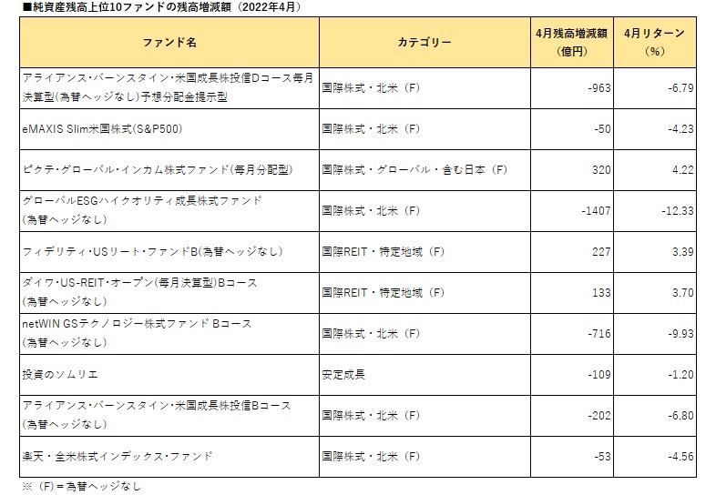 2022年4月の国内ファンド(確定拠出年金専用、ファンドラップ専用、ETF除く)の純資産残高の増減を確認したところ、4分の3以上のファンドで残高が前月末から減少した。世界の株式市場の低調な推移が響いた格好だが、その中にあって、インカムファンドの堅調ぶりが目立った。 同月の日米株式は、NYダウが前月比▲4.91%、日経平均株価が同▲3.50%となるなど揃って反落した。米金利上昇や、中国での新型コロナウイルスの拡大による世界経済の減速懸念が嫌気されたが、中でも、月末に年初来安値を更新したナスダック総合指数が同▲13.26%となるなど、米国成長株が大幅下落に見舞われた。 米国を始めとした世界的な株価下落を受けて、国内ファンドのうち同月に純資産残高が減少したファンドの比率は75.8%に達した。同月末時点の純資産残高上位10ファンドで見ても、7ファンドがマイナスのリターンとなり、残高を減らした。 純資産残高トップの「アライアンス・バーンスタイン・米国成長株投信Dコース毎月決算型(為替ヘッジなし)予想分配金提示型」(前月末比963億円減)や「netWIN GSテクノロジー株式ファンド Bコース(為替ヘッジなし)」(同716億円減)など米国成長株ファンドのほか、「eMAXIS Slim米国株式(S&P500)」(同50億円減)、「楽天・全米株式インデックス・ファンド(愛称:楽天・バンガード・ファンド(全米株式))」(同53億円減)など米国株インデックスファンドも残高を減らした。「グローバルESGハイクオリティ成長株式ファンド(為替ヘッジなし)(愛称:未来の世界(ESG))」の減少額(同1407億円減)は国内ファンドの中で最大となった。 一方、純資産残高上位10ファンドの中で前月末に比べて純資産残高が増加した3ファンドを見ると、「ピクテ・グローバル・インカム株式ファンド(毎月分配型)」(同320億円増)、「フィデリティ・USリート・ファンドB(為替ヘッジなし)」(同227億円増)、「ダイワ・US−REIT・オープン(毎月決算型)Bコース(為替ヘッジなし)」(同133億円増)であり、「ピクテ・グローバル・インカム株式ファンド(毎月分配型)」は増加額が国内全ファンド中でトップとなった。 3ファンドは、いずれもインカムゲインを確保しつつ、キャピタルゲインの獲得を図るファンドである。米国REIT2ファンドは、相対的な利回りの高い米REITへ投資し、「ピクテ・グローバル・インカム株式ファンド(毎月分配型)」は主に世界の高配当利回りの公益企業(電力・ガス・水道・電話・通信・運輸・廃棄物処理・石油供給など)の株式に投資する。3ファンドの同月のリターンはいずれもプラスとなった。インカム収入が支えになったと見られる。 FRB(米連邦準備制度理事会)は、今月3〜4日に開催したFOMC(米連邦公開市場委員会)で、22年ぶりの上げ幅となる0.5%の利上げと、保有資産を圧縮する「量的金融引き締め」を決定した。6、7月の会合でも5月と同じ幅の利上げが実施されるとの見方が広がっている。米金融緩和の正常化の進展は、この数年来の世界株高をけん引してきた米国成長株にとって一段の重しとなる可能性がある。金利上昇はREITファンドにとってもコスト負担の増加に繋がるなどネガティブな側面もあるが、成長株ファンドへ逆風が吹く場面では、REITファンドも含めて、高配当利回りファンドなど、安定したインカム収入の確保を図るファンドの底堅さが意識されそうだ。