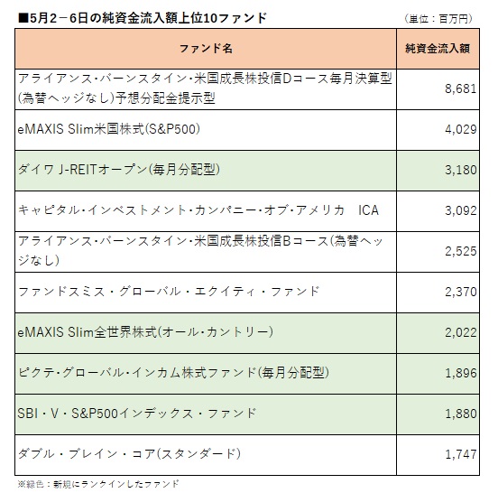 国内公募追加型株式投信(確定拠出年金専用、ファンドラップ専用、及びETF除く)を対象として、ウエルスアドバイザー推計値に基づいて先週(2022年5月2−6日)の純資金流入額上位10ファンドを確認したところ、4ファンドがトップ10内に返り咲いた。 先週トップ10内に返り咲いたのは、「ダイワ J−REITオープン(毎月分配型)」、「eMAXIS Slim全世界株式(オール・カントリー)」、「ピクテ・グローバル・インカム株式ファンド(毎月分配型)」、「SBI・V・S&P500インデックス・ファンド」(愛称:SBI・V・S&P500)。「ダイワ J−REITオープン(毎月分配型)」は3週ぶり、「eMAXIS Slim全世界株式(オール・カントリー)」は2週ぶり、「SBI・V・S&P500インデックス・ファンド」は4週ぶりのランクイン。「ピクテ・グローバル・インカム株式ファンド(毎月分配型)」は2020年8月11−14日以来1年8カ月ぶりのランクインとなった。 先週純資金流入額トップとなったのは、「アライアンス・バーンスタイン・米国成長株投信Dコース毎月決算型(為替ヘッジなし)予想分配金提示型」。87億円の純資金流入となり、4週連続のトップとなった。同シリーズの「Bコース(為替ヘッジなし)」のほか、「eMAXIS Slim米国株式(S&P500)」、「キャピタル・インベストメント・カンパニー・オブ・アメリカ ICA」、「ファンドスミス・グローバル・エクイティ・ファンド」、「ダブル・ブレイン・コア(スタンダード)」が先々週(2022年4月25−28日)に続いてトップ10入りした。 一方、先々週ランクインしていたファンドのうち、「日経225ノーロードオープン」、「楽天 日本株4.3倍ブル」、「野村 ドイチェ・高配当インフラ関連株投信(米ドルコース)年2回決算型」、「フィデリティ・世界割安成長株投信 Bコース(為替ヘッジなし)」(愛称:テンバガー・ハンター)がトップ10圏外となった。