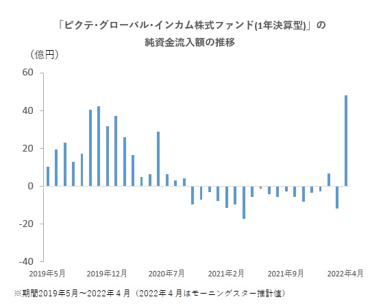 2022年4月の個別ファンドの純資金流出入額(ウエルスアドバイザー推計値)を見ると、インカムファンドの一角へ資金が流入する動きが見られた。インフレ(物価上昇)の高進に対応した米国の金融引き締めやロシア・ウクライナ紛争の長期化、中国での新型コロナウイルス拡大による景気減速懸念などで世界の金融市場が動揺する中、安定的なインカム収益の獲得に対する関心が高まったと見られる。 「ピクテ・グローバル・インカム株式ファンド(1年決算型)」の同月の純資金流入額は48億円となった。12億円の純資金流出となった前月から流入超過に転換しただけでなく、単月の純資金流入額が設定(2008年10月)来の163カ月で最大となった。 同ファンドは、日本を含む世界の高配当利回りの公益企業(電力、ガス、水道、電話、通信、運輸、廃棄物処理、石油供給など)の株式に投資する。公益企業は一般的に規模が大きく収益基盤が安定しているという特徴がある。なお、同シリーズの「毎月分配型」は、先週(5月2−6日)の純資金流入額が19億円となり、2020年8月11−14日以来1年8カ月ぶりに純資金流入額が国内全ファンド(確定拠出年金専用、ファンドラップ専用、及びETF除く)の中で上位10位内となった。 「NWQフレキシブル・インカムファンド 為替ヘッジあり(年1回決算型)」の同月の純資金流入額は28億円となった。設定(2018年12月)来の41カ月連続での純資金流入となり、かつ単月の純資金流入額が最大となった。 同ファンドは、日本を含む世界の企業が発行する米ドル建の株式、投資適格社債、ハイイールド社債、転換社債、ハイブリッド証券などに分散投資するバランス型ファンドで、相対的に高いインカム収益と値上がり益の獲得を目指す。ポートフォリオ構築に際しては、収益性、成長性、財務の健全性などの分析から魅力度が高いと判断した企業を選定し、当該企業が発行する証券の中から、利回りや価格上昇余地などの点から見て投資効率が高いと判断した証券(リスク調整後の期待リターンが高い証券)を選択する。同シリーズの「為替ヘッジなし(毎月決算型)」も同月は47億円の純資金流入となり、年1回決算型と同じく設定来41カ月連続での純資金流入となった。 「マニュライフ・円ハイブリッド債券インカム・ファンド(年1回決算型)」にも資金が流入した。同月の純資金流入額は133億円となり、30億円の純資金流出となった前月から流入超過に転じた。同ファンドは、主に相対的に高い利回りが期待できる日本企業が発行する円建てのハイブリッド債券(劣後債)に投資する。ハイブリッド債券は、債券と株式の中間的な性格を有し、一般の債権者よりも債務弁済の順位が劣るため、通常は同じ会社が発行する普通社債と比べて格付けが低い一方で利回りは高く設定されている。なお、同ファンドでは、ハイブリッド債券でも取得時に投資適格以上の格付けを有する債券への投資を原則としている。 「ピクテ・グローバル・インカム株式ファンド(1年決算型)」は国際株式型、「NWQフレキシブル・インカムファンド 為替ヘッジあり(年1回決算型)」はバランス型、「マニュライフ・円ハイブリッド債券インカム・ファンド(年1回決算型)」は国内債券型ファンドと、3ファンドは主投資先が異なるが、安定的にインカム収益の獲得を目指すという点で共通する。今後、金融市場の先行き不透明感が一層深まった場合には、それぞれの資産の中で存在感が一段と高まることも考えられる。