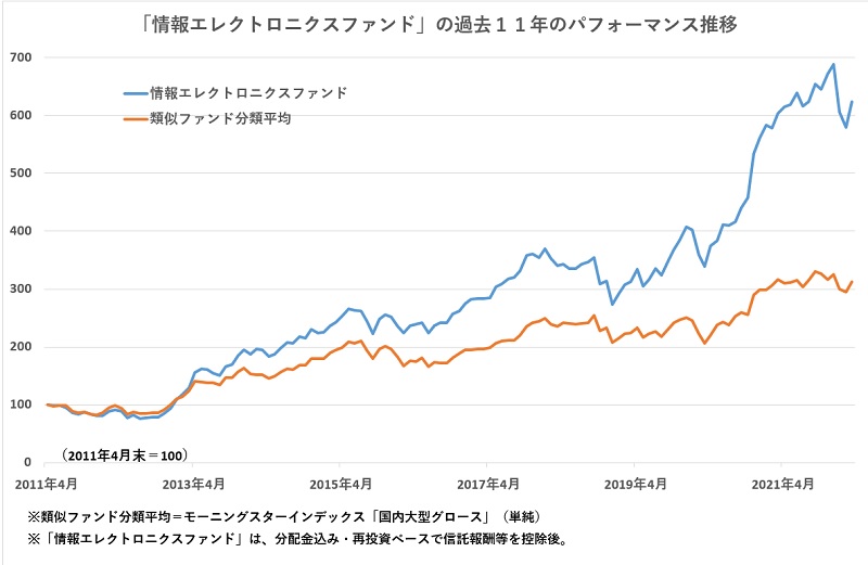 野村アセットマネジメントが設定・運用する「情報エレクトロニクスファンド」は、2021年のトータルリターンが22.62%と、類似ファンド分類平均を11.86%上回り、運用の効率性を測るシャープレシオも2.47と、類似ファンド分類平均を1.26上回った。また、直近は14カ月連続して類似ファンド分類内でトータルリターンが第1位となり、対参考指数ではいずれも10%以上の超過収益を獲得するなど、優れた運用成績を継続的に残している。ファンド オブ ザ イヤー2021の「国内株式型」部門で優秀ファンド賞を受賞した。同ファンドの運用を担当する同社運用部(株式グループ)チーフ・ポートフォリオ・マネージャーの福田泰之氏に、ファンドの運用のポイントを聞いた。 ――ファンドの特徴は? 1984年2月の設定以来、38年の長きにわたり運用を継続してきたファンドです。1984年というのは、一般家庭にVTRが普及し始めたタイミングです。 日本でも有数の歴史を積み重ねた公募投信ですが、その38年間の間に、「平成バブル」、「ITバブル」、「サブプライムローンバブル」といった3度のバブルをくぐり抜けてきました、 私が運用担当となりましたのは東日本大震災の直後である2011年4月でしたので、この4月で運用を担当して丸11年となります。 直近10年間の運用収益(2021年12月末の10年<年率>トータルリターン23.78%)は、米国ナスダック総合指数(円ベース)(同24.47%)に匹敵するパフォーマンスを実現しています。 なおかつ、3年(年率36.00%)、5年(同20.17%)、10年(23.78%)、いずれの期間で見ましても、国内大型グロースカテゴリーでトータルリターンが第1位というパフォーマンスを出しています。安定的に良いパフォーマンスを短中長期で出していることが、アピールポイントです。 ――長期にわたって優れたパフォーマンスを実現できたポイントは? 当ファンドの主な投資対象である電機や情報通信の企業は、景気動向に対する感応度の高い銘柄が多く、そのため、景気や株式市場の状況を見ながら、「攻め」と「守り」のスタンスを臨機応変に変更し、環境に対応したギアチェンジを行って機動的に銘柄選別をしています。 また、業界の変化を察知し、事業機会を成長へと結びつける企業に投資する際に、自信のある銘柄には、しっかりと大きなウエイトをかけるなど、メリハリを効かせたリスクテイクを行う点がこのファンドの特徴です。 ――国内大型株の銘柄選定で優位性がある他、運用のポイントは? 当ファンドは、ウエルスアドバイザー分類では、「国内大型グロース」に分類されているのですが、必ずしも大型株に投資対象を絞っているわけではなく、幅広く、投資対象を発掘していくという方針で考えています。 例えば、「小型ブルーチップオープン」というファンドがあり、私が過去6年にわたって運用を担当していますが、1年のトータルリターン(21年12月末時点で27.40%)が「情報エレクトロニクスファンド」(同22.62%)より高いという状態です。ウエルスアドバイザーからも五つ星のレーティングをいただいているように、大型株だけにとどまらず、中小型銘柄も含めまして幅広く有望銘柄をピックアップできる点に私の運用の特徴があると考えております。 ――投資家へのメッセージは? 日本経済に「停滞」のイメージが強く、日本株に対する個人投資家の方々の関心が以前に比べまして大きく低下した状態が続いています。 ですが、グローバルに事業展開をし、成長シナリオを描くことができる銘柄を適切に選ぶことによって、日本株の投信であっても米ナスダックに劣らないリターンを出せることを過去10年間の実績で示すことができたと考えています。 日本の個人投資家の方々に、このことをもっとご認識いただきまして、自国企業の成長の果実をぜひとも享受していただきたいと思います。そのためにも、今後も良いパフォーマンスを継続し、日本のテクノロジー株に投資するのであれば、「野村の『情報エレクトロニクスファンド』だよね」と言っていただけるような、いわば業界の定番商品にできたらいいと考えております。(グラフは、「情報エレクトロニクスファンド」の過去11年のパフォーマンス推移)