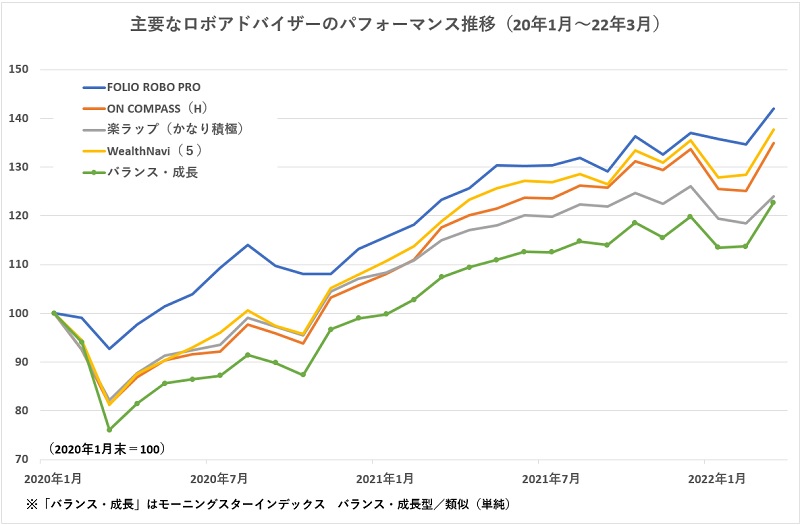 比較可能な4つの「ロボ・アドバイザー」の運用成績を、比較データが揃う2020年1月末から、2022年3月末までの約2年間で比べた。ちょうど、2020年3月の「コロナショック」で世界的に株価が大きく下げた局面での運用成績をみることもできる。なお、SBI証券の「SBIラップ」は「ROBO PRO(FOLIO)」のデータに近い成績が期待される。「ROBO PRO」の運用対象はETFで「SBIラップ」は投信を使うなど異なる点もあるが、同じ運用手法を使っているためだ。2022年3月末までの2年2カ月間の運用成績では、「ROBO PRO」の成績が最も良かった(添付のグラフ参照)。「WealthNavi」は5コース、「楽ラップ」は9コース、「ON COMPASS」には13コースがあるが、その中で、最も高いパフォーマンスをあげているコースで比較した。「ROBO PRO」は、投資対象資産の組み合わせの中で、もっとも投資効率の良い組み合わせを使うため1コースしかない。なお、「バランス・成長型」は、公募投信の「バランス・成長型」に属しているファンドの平均的な運用実績といえるウエルスアドバイザーインデックスを使ったが、「ロボ・アドバイザー」は4つの全てが公募投信の平均を上回った。