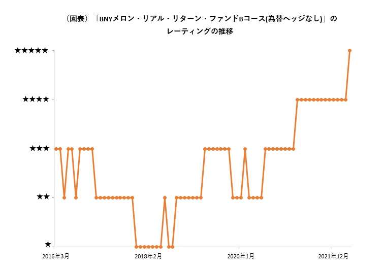 BNYメロン・インベストメント・マネジメント・ジャパンの「BNYメロン・リアル・リターン・ファンドBコース(為替ヘッジなし)」が2022年4月末時点のファンドレーティングで5ツ星を獲得した。5ツ星獲得は2016年3月末のレーティング付与開始から74カ月目にして初めてとなる。 ウエルスアドバイザーでは毎月、運用期間3年以上の国内公募追加型株式投信を対象にレーティングを付与している。レーティングは、対象ファンドのリスク調整後リターンが、その属するウエルスアドバイザーカテゴリーの中でどの水準にあるのかを5段階で示したもの。最上位の5ツ星は相対的な運用効率に優れていることを示す。 2022年4月末時点で、「カテゴリーが前月から継続」かつ「同月時点の純資産残高が100億円以上」である一般の投資家が購入可能なアクティブファンド(確定拠出年金専用、ファンドラップ専用、ETF除く)の中で、レーティングが5ツ星に上昇したファンドは10本ある。そのうち、初の5ツ星獲得となったファンドは、「BNYメロン・リアル・リターン・ファンドBコース(為替ヘッジなし)」と東京海上アセットマネジメントの「東京海上・ベトナム株式ファンド(年1回決算型)」の2本となった。「東京海上・ベトナム株式ファンド(年1回決算型)」は高成長が見込まれる割安感のあるベトナム企業の株式に投資するファンドで、2021年7月末の付与開始から10カ月目で5ツ星を獲得した。 「BNYメロン・リアル・リターン・ファンドBコース(為替ヘッジなし)」は外国籍ファンドを通じて、実質的に世界の株式、債券、通貨等に投資する。外国籍ファンドでは、投資先資産を、相場上昇の恩恵を享受できる「リターン追求資産」(株式、社債、転換社債)と相場下落時の備えとなる「リスク相殺資産」(現金等、国債、商品、通貨)に分類し、投資環境に応じて、両者の配分を機動的に変更することで、米ドルベースでの絶対収益の獲得を目指す。外国籍ファンドはBNYメロン・グループ傘下の英国の資産運用会社が担う。 2022年3月末時点のポートフォリオの資産構成比率は「リターン追求資産」67.4%、「リスク相殺資産」32.6%。2021年12月末時点は「リターン追求資産」81.1%、「リスク相殺資産」19.0%。ロシアのウクライナ侵攻や米国など各国の金融引き締めの動きを踏まえて、足元ではディフェンシブなスタンスを取っている。 2022年4月末時点の過去5年間のトータルリターン(年率)は6.73%とカテゴリー「安定成長」平均を3.29%上回り、カテゴリー内上位5%(237本中10位)となっている。
