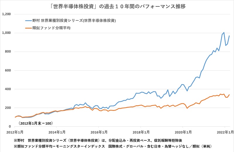 当ファンドは、これまでも2015年の中国景気が減速した局面、2018年に米中貿易戦争が深刻化した局面、2020年の新型コロナウイルスの感染拡大といった下落局面を経験してきました。いずれも1年から2年で全て取り返すことができています。これは基本的には半導体業界の底堅い成長に支えられていて、この傾向は変わらないと思っています。投資家の皆様には、中長期的な視点で、当ファンドを応援していただければと思っています。(グラフは、「野村世界業種別投資シリーズ(世界半導体株投資)」過去10年間のパフォーマンス推移)