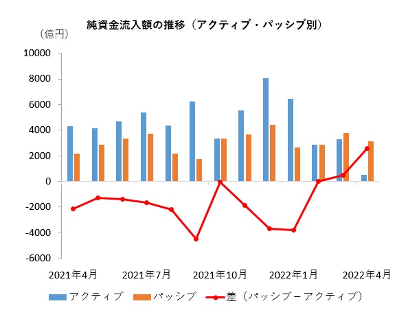インフレの高進、それに対応するための米国を始めとした各国の金融引き締め、ロシアのウクライナ侵攻を受けて株式が急落するなど、世界の金融市場が大揺れとなった2022年4月。国内ファンド(ETF除く)への資金フローを見ると、アクティブファンドが大きな影響を受けた一方で、パッシブファンドには高水準な資金流入が続いた。 4月のアクティブファンドへの純資金流入額は531億円となった。純資金流入が続いたものの、純資金流入額は前月比で2741億円と大幅に減少(83.8%減)した。一方、パッシプファンドは3112億円の純資金流入となった。純資金流入額は前月比652億円減少(17.3%減)したものの、前月の純資金流入額が2010年1月以降の148カ月で第2位と高水準であったためで、4月も148カ月中第8位と水準は高い。第1位は2021年12月であり、パッシブファンドには旺盛な資金流入が続いている。 パッシブファンドとアクティブファンドの純資金流入額の差を見ると、マイナス(アクティブ優位)が続いてたが、前月にプラス(パッシブ優位)に転じ、4月はパッシブが2581億円上回った。金融市場の動揺を背景にパッシブ優位の流れとなっている。 一般の投資家が購入可能な個別ファンド(確定拠出年金専用、ファンドラップ専用、ETF除く)の4月の純資金流入額を見ると、純資金流入額上位10ファンドはアクティブ、パッシブ5ファンドずつとなった。 トップ10入りしたアクティブファンドでは、「アライアンス・バーンスタイン・米国成長株投信Dコース毎月決算型(為替ヘッジなし)予想分配金提示型」が628億円の純資金流入でトップとなったほか、同シリーズの「Bコース(為替ヘッジなし)」が第4位、「キャピタル・インベストメント・カンパニー・オブ・アメリカ ICA」が第5位となった。アクティブファンドについては、投資家からの人気の根強いファンドがある一方で、世界的な金融市場の動揺を受けて、全体としては資金流入が細った。 トップ10入りしたパッシブ5ファンドのうち、456億円の純資金流入で第2位となった「eMAXIS Slim米国株式(S&P500)」を始め、「eMAXIS Slim全世界株式(オール・カントリー)」、「楽天・全米株式インデックス・ファンド」(愛称:楽天・バンガード・ファンド(全米株式))、「SBI・V・S&P500インデックス・ファンド」(愛称:SBI・V・S&P500)と4ファンドをつみたてNISA採用ファンドが占めた。株価急落など金融市場が揺れる中でも、積立投資による安定した資金が低コストのインデックスファンドに流入していたと言える。