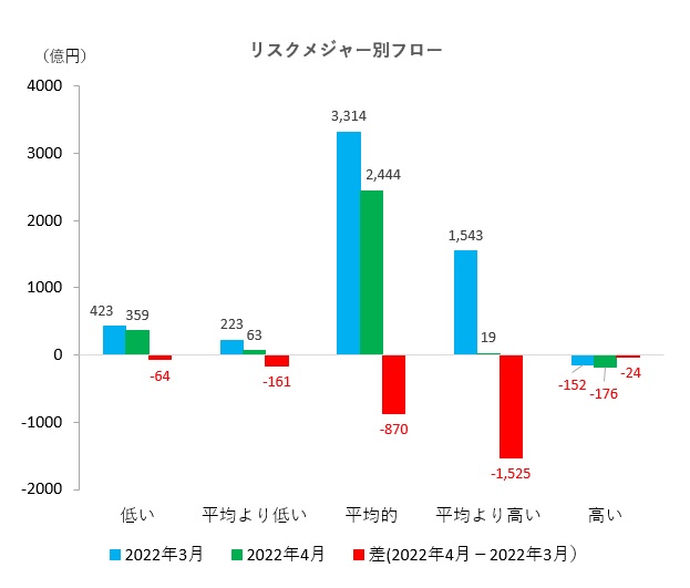 米国株式が急落するなど、2022年4月は、インフレの高進、各国の金融引き締め、ウクライナ危機などを受けて世界の金融市場が揺れた。ウエルスアドバイザーのリスクメジャー別の資金フローを見ると、投資家のリスクに対する意識の高まりが窺える。 リスクメジャーは、運用期間3年以上の国内ファンドについて、ファンドのリスク(標準偏差)が全ファンド中でどの水準にあるのかを、「低い」、「やや低い」、「平均的」、「やや高い」、「高い」の5段階で示したものである。 4月は、金融市場の混乱を背景に、リスクメジャー付与全ファンドに対する純資金流入額が前月比49.4%減の2709億円と前月からほぼ半減した。リスクメジャー別でも、「低い」、「平均より低い」、「平均的」、「平均より高い」は純資金流入が続いたものの、流入超過額はいずれも前月から減少した。「高い」は前月に続いて純資金流出となり、流出超過額は前月から24億円増加した。 「低い」、「平均より低い」、「平均的」、「平均より高い」の中でも、流入超過額の減少額が大きいのが「平均より高い」。4月の純資金流入額は19億円と前月比で1525億円(98.8%減)も減少した。次に減少額が大きかったのは「平均的」で、純資金流入額は前月比870億円減少した。 全体的に資金流入の勢いが弱まる中で、相対的にリスク水準の高い「平均的」、「平均より高い」においてその傾向が強く見られた。純資金流出が継続した「高い」と合わせて、投資家がリスクの高いファンドに対して慎重姿勢を強めていると見られる。5月も世界の株式市場が乱高下するなど金融市場に落ち着きは見られない。リスク警戒から回避へとシフトが進むか注目される。
