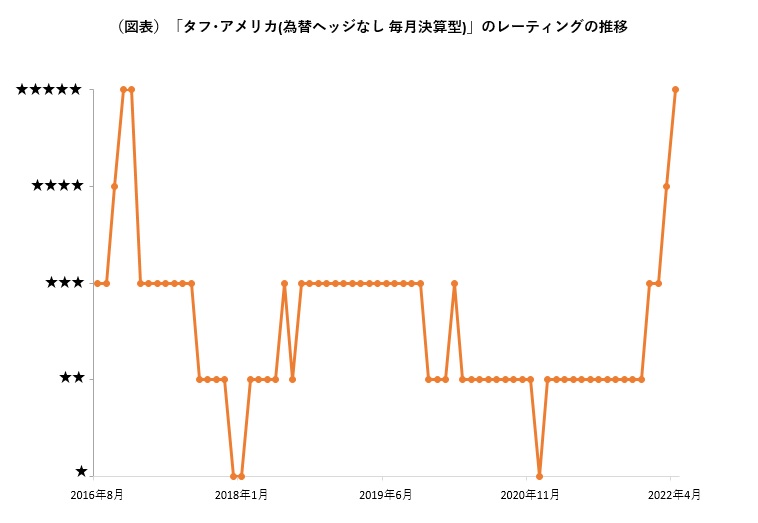 三井住友DSアセットマネジメントの「タフ・アメリカ(為替ヘッジなし 毎月決算型)」のパフォーマンスが改善している。2022年4月末時点のファンドレーティングは2016年12月末以来64か月ぶりの5ツ星となった。 ウエルスアドバイザーでは毎月、運用期間3年以上のファンドを対象にレーティングを付与している。レーティングは、リスク調整後のリターンがその属するカテゴリーの中でどの水準にあるのかを5段階で示したもので、最上位の5ツ星は相対的な運用効率に優れていることを表す。 同ファンドは64カ月ぶりの5ツ星となったが、2020年12月に1つ星を付けた後、2021年12月まで12カ月連続で2ツ星となるなど直近まで低空飛行が続いていた。変化が表れたのは今年に入ってからで、1月に3ツ星となった後、3月に4ツ星に上昇、そして4月には5ツ星となった。 同ファンドは、外国籍ファンドへの投資を通じて、実質的に米ドル建ての債券、高配当株式、REITなどに分散投資する。具体的には、高配当株式、REIT、転換社債などに投資する「エクイティ・インカム・ファンド」と、投資適格社債、ハイイールド債券、資産担保証券など様々な種類の債券に投資する「トータルリターン・ファンド」に投資し、投資環境に応じて両ファンド間の資産配分を機動的に見直すほか、各ファンド内の配分比率も変更する。実質的な運用は、米ニューバーガー・バーマン・グループが行う。 直近半年間(2021年11月〜2022年4月)のポートフォリオを見ると、「エクイティ・インカム・ファンド」が54.2〜59.2%の範囲内、「トータルリターン・ファンド」は38.9〜43.9%の範囲内となった。株式市場が下落したタイミングを捉えて株式の比率を引き上げている。 同ファンドの過去3カ月間のリターン・シャープレシオの推移を見ると、2021年11月以降、いずれもカテゴリー「安定成長」内で上位3%内となっている。米金利の上昇を受けて債券が冴えない中、米株高、REIT高となった2021年10月、同12月、2022年3月を中心に株式とREITがプラスに寄与している。また、為替相場の円安・ドル高も支援材料となっている。