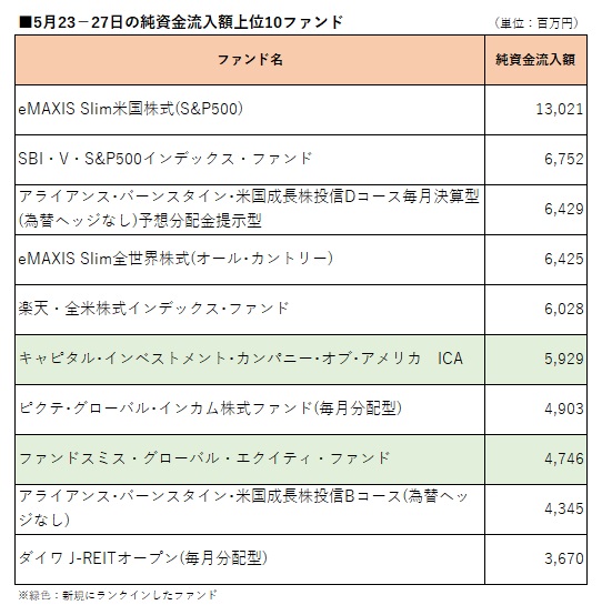国内公募追加型株式投信(確定拠出年金専用、ファンドラップ専用、及びETF除く)を対象として、ウエルスアドバイザー推計値に基づいて先週(2022年5月23−27日)の純資金流入額上位10ファンドを確認したところ、「eMAXIS Slim米国株式(S&P500)」が3週連続のトップとなったほか、2ファンドがトップ10内に返り咲いた。 「eMAXIS Slim米国株式(S&P500)」の純資金流入額は130億円となった。今年は先週までの21週のトップを、同ファンドと「アライアンス・バーンスタイン・米国成長株投信Dコース毎月決算型(為替ヘッジなし)予想分配金提示型」の2ファンドで分け合っており、同ファンドのトップ獲得は今年8回目となる。 両ファンドのほか、「SBI・V・S&P500インデックス・ファンド」(愛称:SBI・V・S&P500)、「eMAXIS Slim全世界株式(オール・カントリー)」、「楽天・全米株式インデックス・ファンド」(愛称:楽天・バンガード・ファンド(全米株式))、「ピクテ・グローバル・インカム株式ファンド(毎月分配型)」、「アライアンス・バーンスタイン・米国成長株投信Bコース(為替ヘッジなし)」、「ダイワ J−REITオープン(毎月分配型)」が先々週(2022年5月16−20日)に続いてトップ10内となった。 先週トップ10内に返り咲いたのは、「キャピタル・インベストメント・カンパニー・オブ・アメリカ ICA」と「ファンドスミス・グローバル・エクイティ・ファンド」。両ファンドとも5月2−6日以来3週ぶりのトップ10入りとなった。 先週は、トップの「eMAXIS Slim米国株式(S&P500)」に続いて、「SBI・V・S&P500インデックス・ファンド」(愛称:SBI・V・S&P500)が第2位、「楽天・全米株式インデックス・ファンド」(愛称:楽天・バンガード・ファンド(全米株式))が第5位と、米国株式に投資する低コストのインデックスファンドが優勢であった。先週の米国株式では、米金融引き締めに対する警戒感が和らいだことを受けて、NYダウが9週ぶり、S&P500種株価指数は8週ぶりに反発した。 一方、先々週ランクインしていたファンドのうち、「ダイワ・US−REIT・オープン(毎月決算型)Bコース(為替ヘッジなし)」、「フィデリティ・世界割安成長株投信 Bコース(為替ヘッジなし)」(愛称:テンバガー・ハンター)がトップ10圏外となった。