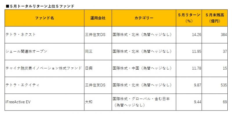 インフレの高進、各国の金融引き締め、ウクライナ問題、景気減速懸念などに揺れた2022年5月。国内ファンドの月次トータルリターンランキングを見たところ、三井住友DSアセットマネジメントの「テトラ・ネクスト」がトップとなり、「テトラ・エクイティ」が第4位となった。 国内公募追加型株式投信(ETF除く)のうち、通貨選択型及びブル・ベア型を除く、5月末時点の純資産残高10億円以上のファンドを対象とした。 トップの「テトラ・ネクスト」の月次リターンは14.26%、第4位の「テトラ・エクイティ」の月次リターンは9.87%。「テトラ・ネクスト」は前月の▲7.83%、「テトラ・エクイティ」は同▲6.15%から大きく切り返した。 両ファンドは、米国株式市場で「日中」、「月初」、「月中」、「月末」に発生する4つのトレンドを捉えて株価指数先物を売買することにより、市場の上昇・下落両局面において収益の獲得を目指す。具体的には、「日中トレンド戦略」、「月初トレンド戦略」、「月中トレンド戦略」、「月末トレンド戦略」を組み合わせ、それぞれの戦略において、「テトラ・ネクスト」ではナスダック100先物の動きを踏まえて同先物を買建てもしくは売建て(「月初トレンド戦略」は原則買建て)、「テトラ・エクイティ」ではS&P500先物の動きを踏まえて同先物を買建てもしくは売り建てる(「月初トレンド戦略」は原則買建て)。2022年5月はナスダック総合指数、S&P500ともに続急落となる中で、両ファンドともに大幅なプラスのリターンを獲得した。 その他のリターン上位ファンドは、第2位が「シェール関連株オープン」(月次リターン11.95%)、第3位が「チャイナ脱炭素イノベーション株式ファンド」(同11.78%)、第5位が「iFreeActive EV」(同9.44%)となった。 「シェール関連株オープン」は米国、カナダ及びメキシコのシェール関連企業の株式に投資し、投資に際しては、シェールガス/オイルの生産拡大による成長が見込まれる企業や、エネルギーコストの低下による恩恵が見込まれる企業に着目する。「チャイナ脱炭素イノベーション株式ファンド」は、脱炭素関連のビジネスを行う中国企業、及び社会の脱炭素化による恩恵が期待される中国企業の株式に投資する。「iFreeActive EV」は、日本を含む世界のEV(電気自動車)関連企業10〜20社程度に厳選して投資する。