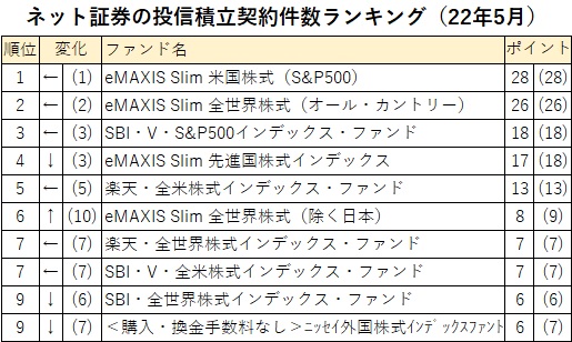 大手ネット証券3社の投信積立契約件数ランキング(月次、22年5月)のトップ3は「eMAXIS Slim 米国株式(S&P500)」、「eMAXIS Slim 全世界株式(オール・カントリー)」、「SBI・V・S&P500インデックス・ファンド」で変化がなかった。この3ファンドがトップ3に並ぶのは22年2月以来4カ月連続になっている。この3ファンド以外で、目立ったのは「eMAXIS Slim 全世界株式(除く日本)」が前月10位から、6位にジャンプアップしたことだ。ただ、同ファンドの獲得ポイントは前月の9ポイントから8ポイントに減少している。上位3本以外の獲得ポイントは拡散する傾向があり、積立投資対象の選定に気迷い感が強まっている。 ランキングは、定期的に月次の投信積立契約件数トップ10を公表しているSBI証券、楽天証券、マネックス証券の公開情報を使用。各社ランキング1位に10点、以下、順位が落ちるたびに1点を減点し、第10位を1点として、3社のランキング10位までのファンドの点数を集計した。 投信積立契約は、基本的に数年間、または、数十年間という継続投資を志向していると考えられる。毎月1万円や数千円でも、長期にわたって継続的に資金を積み立てることによって、将来の大きな資産形成に結び付けようという投資行動だ。その際には、長期にわたる成長が期待できる投資対象であること、さらに、できるだけ低コストであることが投資対象に選ばれる条件になっている。トップ3を独走する3ファンドは、世界経済の主柱といえる米国の大型企業で構成される「S&P500」、また、新興国を含む世界の株式に幅広く投資する「MSCIオール・カントリー・ワールド・インデックス」に連動するインデックスファンドであり、中長期の世界経済の成長という誰もが期待する確かな成長期待をバックボーンに、運用コストも年率税込み0.1%台という最低水準のコストになっている。その点では、「S&P500」、「全世界株式」、「先進国株式/外国株式」、「全米株式」などのインデックスファンドは、投信積立契約の「定番」として定着した。 積立投資による資産形成に焦点を当てた税制優遇口座である「つみたてNISA」は、制度がスタートした2018年1月から4年が経過した21年12月末時点で518万口座が開設されたが、その多くが投資初心者の若年層であったことを考えれば、投資の基本に忠実なファンド群が、投信積立契約件数で上位を占める現在の姿は、非常に望ましい状況といえる。 岸田内閣では年内に「資産所得倍増プラン」を発表するとし、現在の「つみたてNISA」や「iDeCo(個人型確定拠出年金)」など積立型の資産形成口座の機能強化を予定している。日本に根付き始めた積立投資の芽を、より豊かに大きく実らせようというねらいだろう。 「投資はじめ」の基本動作が順調に滑り出し、「その次」を展望した場合の「次の一手」として期待されるのが、現在のランキングでトップ10に届いていない銘柄群といえる。そこには、アクティブファンド(「ひふみプラス」「年金積立Jグロース」など)、バランス型(「マネックス資産設計ファンド<育成型>」「楽天・資産づくりファンド(しっかりコース)」など)、そして、レバレッジ型(「楽天レバレッジNASDAQ−100」「iFreeレバレッジNASDAQ100」など)が控えている。「1万円を積立投資した後の次の1万円」、あるいは、「つみたてNISAの投資上限の3.3万円を超える積立資金」など、投資に対するリテラシーがある程度高まった後の「次の手」として考えられる銘柄群といえる。 日本の資産運用環境が「豊か」と感じられる次の時代を拓くカギになるのが、しっかりしたアクティブファンドの台頭であり、納得の運用成績を返す安定的なバランスファンドの成長、そして、投資にアクセントをつけるレバレッジ型などバラエティ豊かな商品の品揃えということになる。ネット証券大手の投信積立契約件数ランキングに、このような日本の投資事情の縮図が見て取れるのは、このチャネルが日本の投信市場、そして、資産形成市場の重要な販売窓口として位置づけられるようになったからだろう。