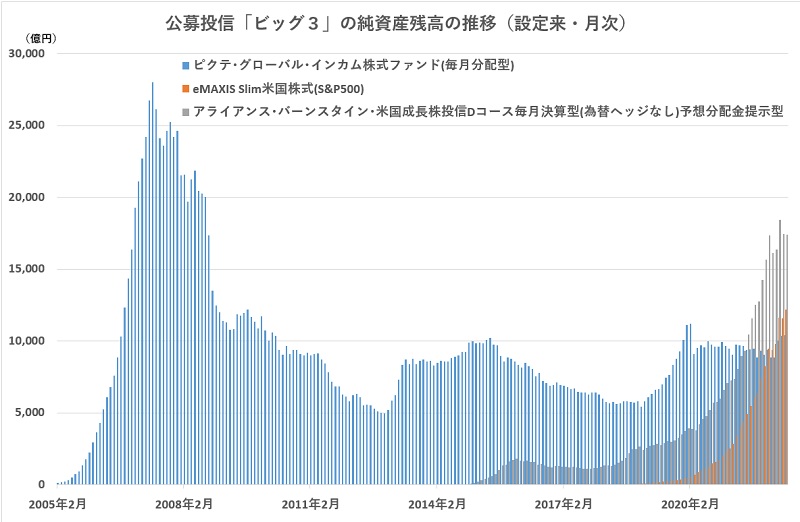 国内最大の公募投信が米国株式のインデックスファンド「eMAXIS Slim 米国株式(S&P500)」に代ろうとしている。現在のところ、米株アクティブファンドの「アライアンス・バーンスタイン・米国成長株投信Dコース」がトップに君臨し、第2位である同ファンドとの残高の差は5000億円ほどあるが、5月には同ファンドに公募投信で最大の700億円超の資金流入があり、トップとの差が縮まってきた。同ファンドの残高拡大を支えているのは、つみたてNISAをはじめとしたネット証券を通じた積立投資での継続的な資金流入と考えられる。かつては、「グロソブ(グローバル・ソブリン・オープン)」や「グロイン(ピクテ・グローバル・インカム株式ファンド)」など市場を席巻する大型ファンドが登場したが、これらは全てアクティブファンドであり、金融機関の窓口を通じた積極的な営業の働きかけの力があった。インデックスファンドは、主として投資家の自発的な行動によって購入されていると考えられ、そのファンドが国内最大を記録するようだと、投信市場が大きな変化を遂げた象徴になると考えられる。 「eMAXIS Slim 米国株式(S&P500)」の設定は、2018年7月3日だった。設定後に残高が1000億円を超えるまでには、約2年の歳月を必要としたが、残高が1000億円を超えてからは、目覚ましい成長を遂げた。実際に、2019年12月末時点の残高は444億円にすぎなかったが、20年12月末には2289億円、21年12月末には9488億円に成長し、22年5月末には1兆2209億円になった。1年間で残高が4倍〜5倍というスピードで拡大しており、21年12月末時点の残高が1年間で2倍にでも成長すれば、22年12月末には2兆円に迫る残高に膨らんで、現在のトップである「アライアンス・バーンスタイン・米国成長株投信Dコース」の残高である1兆7390億円を抜いてしまう可能性がある。 もちろん、「アライアンス・バーンスタイン・米国成長株投信Dコース」も残高が成長しているファンドといえ、19年12月末時点で3736億円だった残高が、20年12月末には7082億円、21年12月末には1兆7368億円に成長した。ただ、22年3月末に1兆8416億円まで残高を伸ばした後は、足踏み状態になっている。 そもそも「アライアンス・バーンスタイン・米国成長株投信Dコース」のようなアクティブファンドが市場で人気を得るには、「なぜ、このファンドが他と比べて魅力があるのか?」ということについて、しっかりとした理由が知られる必要がある。アクティブファンドは、運用方針や運用体制が、それぞれに異なり、個々の運用会社が創意工夫してインデックスファンドを凌駕するパフォーマンスを実現しようと努力している。「アライアンス・バーンスタイン社の運用力がいかに優れているか」、そして、同社が運用する数あるアクティブファンドの中で、「今投資するのであれば、『米国成長株投信』がいかに魅力的であるのか」について、納得のいく説明が必要だ。その説明を担っていたのが、投信を取り扱う金融機関の営業員(投信販売担当者)だ。情熱を込めて、同ファンドのすばらしさを力説する営業員が多くいたからこそ、同ファンドは、残高が1兆7000億円を超える巨大なファンドに成長した。 残高1兆円を超えるファンドは、現存する公募投信4347本(22年6月2日現在、DC専用・SMA専用除く、ETF除く)のうち、わずかに3本だ。全体の比率は0.069%という希少な存在といえる。その1兆円越えを実現したファンドは、2000年2月に設定され、当初募集で1兆円規模の資金を集め、初の1兆円ファンドとして歴史を作った「ノムラ日本株戦略ファンド(愛称:Big Project−N)」をはじめ、2008年7月に残高が5兆7000億円規模に膨らんだ史上最高残高のファンド「グロソブ(グローバル・ソブリン・オープン<毎月決算型>)」、そして、現在も1兆円超えの残高を誇る「グロイン(ピクテ・グローバル・インカム株式ファンド<毎月分配型>)」など10本を超えるファンドがあるが、それらは全てアクティブファンドだった。 投信販売員がその魅力を訴えて、多くの投資家に運用方針等の説明を行ったことによって巨額の残高を得るに至った。 それら巨大なアクティブファンドに共通するのは、大きな規模のファンドに育った後で、徐々に人気が離散して残高も減少していくということだ。極端な事例ではファンドの設定当初に残高のピークを迎え、その後、残高がジリ貧になってしまうファンドもあった。投信販売員の力によって残高を獲得したファンドの場合、継続的に営業員がそのファンドの推奨を行うわけではないという限界がある。毎月多くのファンドが新規設定され、また、市場環境も変化するため、その時々で営業員が注力するファンドは変化している。 このような過去の1兆円ファンドと異なり、「eMAXIS Slim 米国株式(S&P500)」は、営業員の手をほとんど介さずに残高が積み上がってきた初めてのケースといえる。そもそも同ファンドは、「業界最低水準の信託報酬率」を標ぼうしており、販売手数料はゼロであり、運用報酬として継続