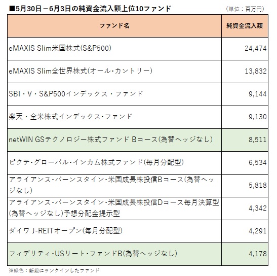 国内公募追加型株式投信(確定拠出年金専用、ファンドラップ専用、及びETF除く)を対象として、ウエルスアドバイザー推計値に基づいて先週(2022年5月30日−6月3日)の純資金流入額上位10ファンドを確認したところ、「eMAXIS Slim米国株式(S&P500)」が4週連続のトップとなるなど米国株式に投資する低コストなインデックスファンドへの流入が継続した。 「eMAXIS Slim米国株式(S&P500)」の純資金流入額は245億円となった。トップ獲得は今年9回目となる。同ファンドのほかには、「SBI・V・S&P500インデックス・ファンド」(愛称:SBI・V・S&P500)が第3位、「楽天・全米株式インデックス・ファンド」(愛称:楽天・バンガード・ファンド(全米株式))が第4位と、米国株式に投資する低コストなインデックスファンドが存在感を発揮した。第2位の「eMAXIS Slim全世界株式(オール・カントリー)」は全世界株式を投資対象とするが、米国株の比率が高い。 先週の米国株式市場は、金融引き締めに対する警戒感からNYダウ、S&P500、ナスダック総合指数の主要3指数が揃って反落した。「アライアンス・バーンスタイン・米国成長株投信Dコース毎月決算型(為替ヘッジなし)予想分配金提示型」が第8位に入ったものの、純資金流入額が以前と比べて減少基調となるなど、高水準な資金流入が続いていたアクティブファンドの一部で資金流入が鈍る一方で、上位を占めた米国株式インデックスファンドには、積立投資を背景に安定的な資金流入が継続している。 「eMAXIS Slim米国株式(S&P500)」、「SBI・V・S&P500インデックス・ファンド」、「楽天・全米株式インデックス・ファンド」、「eMAXIS Slim全世界株式(オール・カントリー)」、「アライアンス・バーンスタイン・米国成長株投信Dコース毎月決算型(為替ヘッジなし)予想分配金提示型」のほかには、「ピクテ・グローバル・インカム株式ファンド(毎月分配型)」、「アライアンス・バーンスタイン・米国成長株投信Bコース(為替ヘッジなし)」、「ダイワ J−REITオープン(毎月分配型)」が先々週(2022年5月23−27日)に続いてトップ10入りした。 先週トップ10内に返り咲いたのは、「netWIN GSテクノロジー株式ファンド Bコース(為替ヘッジなし)」と「フィデリティ・USリート・ファンドB(為替ヘッジなし)」。「netWIN GSテクノロジー株式ファンド Bコース(為替ヘッジなし)」は3月28日−4月1日以来、「フィデリティ・USリート・ファンドB(為替ヘッジなし)」は3月14−18日以来のランクインとなった。 一方、先々週ランクインしていたファンドのうち、「キャピタル・インベストメント・カンパニー・オブ・アメリカ ICA」、「ファンドスミス・グローバル・エクイティ・ファンド」がトップ10圏外となった。