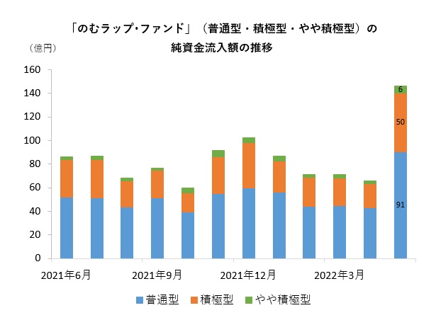 ウエルスアドバイザーの推計によると、野村アセットマネジメントのバランスファンド「のむラップ・ファンド」シリーズへの資金流入が2022年5月に拡大し、残高の大きな「普通型」、「積極型」のほか、「やや積極型」で純資金流入額が設定来最大となった。 同シリーズは、インデックスタイプのマザーファンドへの投資を通じて、実質的に国内株式、国内債券、外国株式、外国債券、世界REIT(含む日本)に分散投資する。リスク水準の異なる「保守型」、「やや保守型」、「普通型」、「やや積極型」、「積極型」がある。各資産への投資配分比率は各資産の期待リターンや推定リスク、各資産間の相関係数などを基に決定するが、原則として、リスク性資産(国内株式、外国株式、世界REIT合計)の投資比率は、保守型50%以内、やや保守型60%以内、普通型75%以内、やや積極型85%以内、積極型は制限なし、とする。2022年4月末時点のリスク性資産の比率は、「普通型」で51.8%、「積極型」で76.2%となっている。 シリーズ5本について、設定(『保守型』、『普通型』、『積極型』は2010年3月、『やや保守型』と『やや積極型』は2016年11月)来で純資金流出入が流入超過となった月の比率を見ると、78〜93%と全体的に資金流入傾向が強い。2022年5月の純資金流入額が設定来最大となった「普通型」は同月まで17カ月連続、「積極型」と「やや積極型」は15カ月連続での純資金流入となっている。 「普通型」、「積極型」、「やや積極型」のうち、単月の流入額が相対的に多い「普通型」と「積極型」の2022年5月の純資金流入額は、それぞれ91億円、50億円となり、前月比では「普通型」が2.1倍、「積極型」が2.5倍となった。直近(2021年6月〜2022年4月)の推移を見ると、「普通型」が39〜60億円、「積極型」が17〜38億円の範囲内となっており、両ファンドともに2022年5月の急増ぶりが際立つ。 リスクに見合ったリターンを獲得できているか判断する指標であるシャープレシオは、2022年5月末までの10年間で「普通型」が0.98とウエルスアドバイザーカテゴリー「バランス」平均を0.06上回り、カテゴリー内上位33%(113本中37位)、「積極型」は0.96とカテゴリー「成長」平均を0.07上回り、カテゴリー内上位31%(26本中8位)となっている。 純資産残高の推移を見ると、「普通型」、「積極型」ともに2020年3月のコロナショック後に増加基調が強まっており、2022年6月6日時点では「普通型」が1899億円、「積極型」が875億円。シリーズ5本では3467億円にまで拡大している。