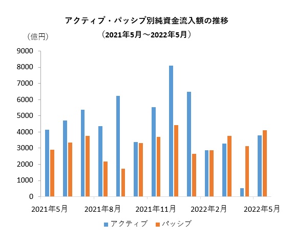 ウエルスアドバイザーの推計によると、2022年5月のパッシブファンド(ETF除く)への純資金流入額は前月比32.0%増の4109億円となった。過去10年間(2012年6月〜2022年5月)では、2021年12月の4410億円に次ぐ第2位となった。年初からの金融市場の動揺を受けてアクティブファンドへの純資金流入額が大きく変動する一方で、パッシブファンドには高水準な資金流入が続いている。 パッシブファンドの純資金流入額は、2022年3月に3764億円となり過去10年間で第3位、4月は3112億円で同9位となった。1、2月も2000億円台後半の純資金が流入した。過去10年間の純資金流入額上位10カ月を見ると、うち9カ月が2021年3月以降となった。パッシブファンドには昨年から高水準な資金が流入しており、新型コロナウイルスのオミクロン型が出現した2021年11月や、米金融引き締め観測とウクライナ問題が響いた2022年1、2、4月といった金融市場が大きく揺れた月においても、高水準な資金流入が続いた。 アクティブファンド(ETF除く)への2022年5月の純資金流入額は3776億円となった。米金利上昇を受けたグロース株の急落を背景に純資金流入額が531億円と大幅に落ち込んだ4月からは回復したが、パッシブファンドには届かなかった。2022年3月から3カ月連続して、パッシブファンドへの純資金流入額がアクティブファンドの純資金流入額を超過した。 アクティブファンドは2022年2月、4月に純資金流入額が前月から急減した。今年に入ってから、金融市場の動揺を受けた資金フローの変動が激しく、高水準な資金流入が続くパッシブファンドとは対照的である。リスク回避局面で資金流入が細ったアクティブファンドに対して、パッシブファンドは低コストファンドを中心に積立投資も含めて安定した資金流入が続いている。 5月の純資金流入額の上位5ファンド(ETF除く)を見ると、トップの「eMAXIS Slim米国株式(S&P500)」を始め、第3位の「eMAXIS Slim全世界株式(オール・カントリー)」、第4位の「SBI・V・S&P500インデックス・ファンド」(愛称:SBI・V・S&P500)、第5位の「楽天・全米株式インデックス・ファンド」(愛称:楽天・バンガード・ファンド(全米株式))と4ファンドを米国株式もしくは全世界株式に投資するインデックスファンドが占めた。いずれもつみたてNISA採用の低コストファンドであり、純資金流入額は前月から増加した。一方、第2位にはアクティブファンドの「アライアンス・バーンスタイン・米国成長株投信Dコース毎月決算型(為替ヘッジなし)予想分配金提示型」が入ったが、純資金流入額は前月から減少した。 インフレの高進、米金融引き締め加速に対する懸念、ウクライナ問題の長期化観測など、金融市場が不安材料を数多く抱えている状況に変わりはない。低コストファンドがけん引役となり、パッシブファンドへの高水準な資金流入が継続するか注目したい。