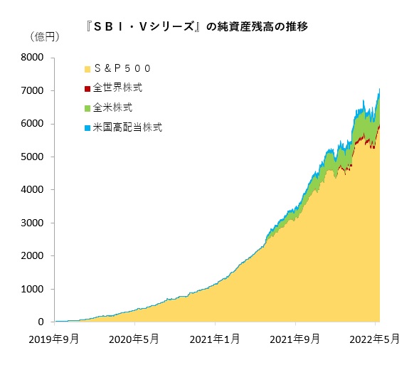 SBIアセットマネジメントの「SBI・V・S&P500インデックス・ファンド」(愛称:SBI・V・S&P500)の純資産残高が6月8日に6004億円となり、設定(2019年9月26日)から2年8カ月余り、657営業日目で6000億円に到達した。米国株式に投資するインデックスファンドでは最速での到達となる。 同日には、楽天投信投資顧問の「楽天・全米株式インデックス・ファンド」(愛称:楽天・バンガード・ファンド(全米株式))の純資産残高も6000億円に到達した。同日時点で、国内インデックスファンド(ETF除く)のうち純資産残高が6000億円を超えるファンドは、上記2ファンドのほか、三菱UFJ国際投信の「eMAXIS Slim米国株式(S&P500)」(同日時点の残高は1兆2901億円)の3ファンドがあり、いずれも米国株式に投資する。6000億円到達までの所要日数は、「楽天・全米株式インデックス・ファンド」が1141営業日、「eMAXIS Slim米国株式(S&P500)」が766営業日であり、「SBI・V・S&P500インデックス・ファンド」が最も短い。 『SBI・V・S&P500』は、米バンガード社のETFを組み入れたノーロード・低コストインデックス4ファンドからなる「SBI・Vシリーズ」の旗艦ファンドである。投資先ETFの信託報酬を含めた実質的な信託報酬等(税込)は年0.0938%程度と「SBI・V・全米株式インデックス・ファンド」(愛称:SBI・V・全米株式)と並んで、米国株式に投資するインデックスファンドの中で最安水準である。 「SBI・Vシリーズ」は、4ファンドともに設定から2022年5月まで純資金流入が継続している。『SBI・V・S&P500』は33カ月連続、『SBI・V・全米株式』と「SBI・V・米国高配当株式インデックス・ファンド」(愛称:SBI・V・米国高配当株式)は12カ月連続、「SBI・V・全世界株式インデックス・ファンド」(愛称:SBI・V・全世界株式)は5カ月連続の純資金流入となった。 また、6月8日には『SBI・V・全世界株式』の純資産残高が100億円に到達し、シリーズ4本合計では7072億円と7000億円超えとなった。