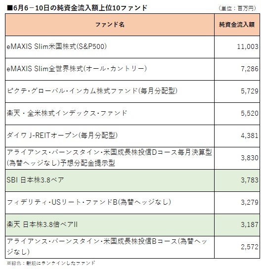国内公募追加型株式投信(確定拠出年金専用、ファンドラップ専用、及びETF除く)を対象として、ウエルスアドバイザー推計値に基づいて先週(2022年6月6−10日)の純資金流入額上位10ファンドを確認したところ、「SBI 日本株3.8ベア」、「楽天 日本株3.8倍ベアII」が新規にランクインした。 「SBI 日本株3.8ベア」は2020年11月9−13日以来1年7カ月ぶり、「楽天 日本株3.8倍ベアII」は設定(2022年3月16日)来初のランクインとなった。ともに株価指数先物取引を積極的に活用することで、日々の基準価額の値動きが国内株式市場全体の値動きの概ね3.8倍程度逆となることを目指して運用する。先週は、米国株式が大幅続落する一方で国内株式は小幅ながらも続伸した。米国株安を受けて対象ファンド全体の純資金流出入額が345億円の純資金流出と2021年10月18−22日以来の流出超過となる中で、国内株式ベア型ファンドの一角には国内株式の上昇一服後の下落を見込んだ資金が流入したと見られる。 先週の純資金流入額トップは「eMAXIS Slim米国株式(S&P500)」で、5週連続のトップとなった。同ファンドのほかには、「eMAXIS Slim全世界株式(オール・カントリー)」、「ピクテ・グローバル・インカム株式ファンド(毎月分配型)」、「楽天・全米株式インデックス・ファンド」(愛称:楽天・バンガード・ファンド(全米株式))、「ダイワ J−REITオープン(毎月分配型)」、「アライアンス・バーンスタイン・米国成長株投信」の「Dコース毎月決算型(為替ヘッジなし)予想分配金提示型」と「Bコース(為替ヘッジなし)」、「フィデリティ・USリート・ファンドB(為替ヘッジなし)」が先々週(2022年5月30日−6月3日)に続いてトップ10入りした。 一方、先々週ランクインしていたファンドのうち、「SBI・V・S&P500インデックス・ファンド」(愛称:SBI・V・S&P500)、「netWIN GSテクノロジー株式ファンド Bコース(為替ヘッジなし)」がトップ10圏外となった。